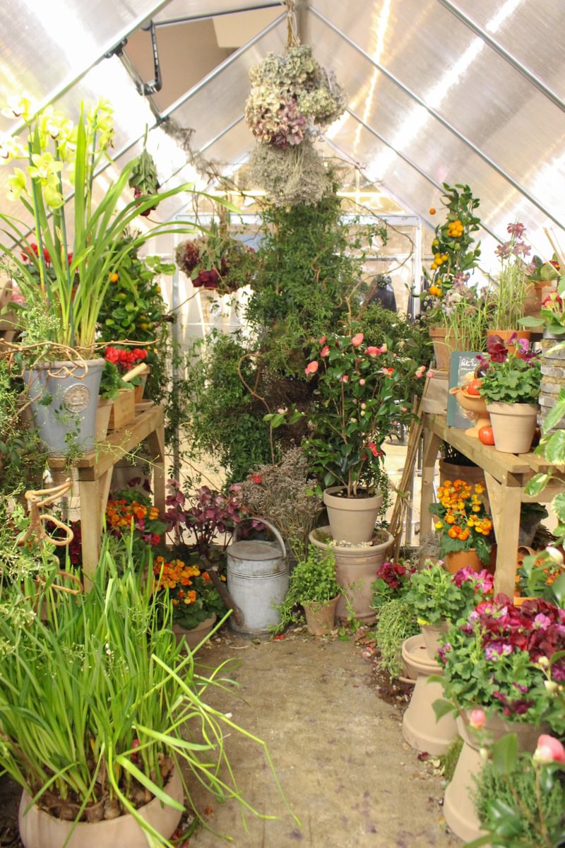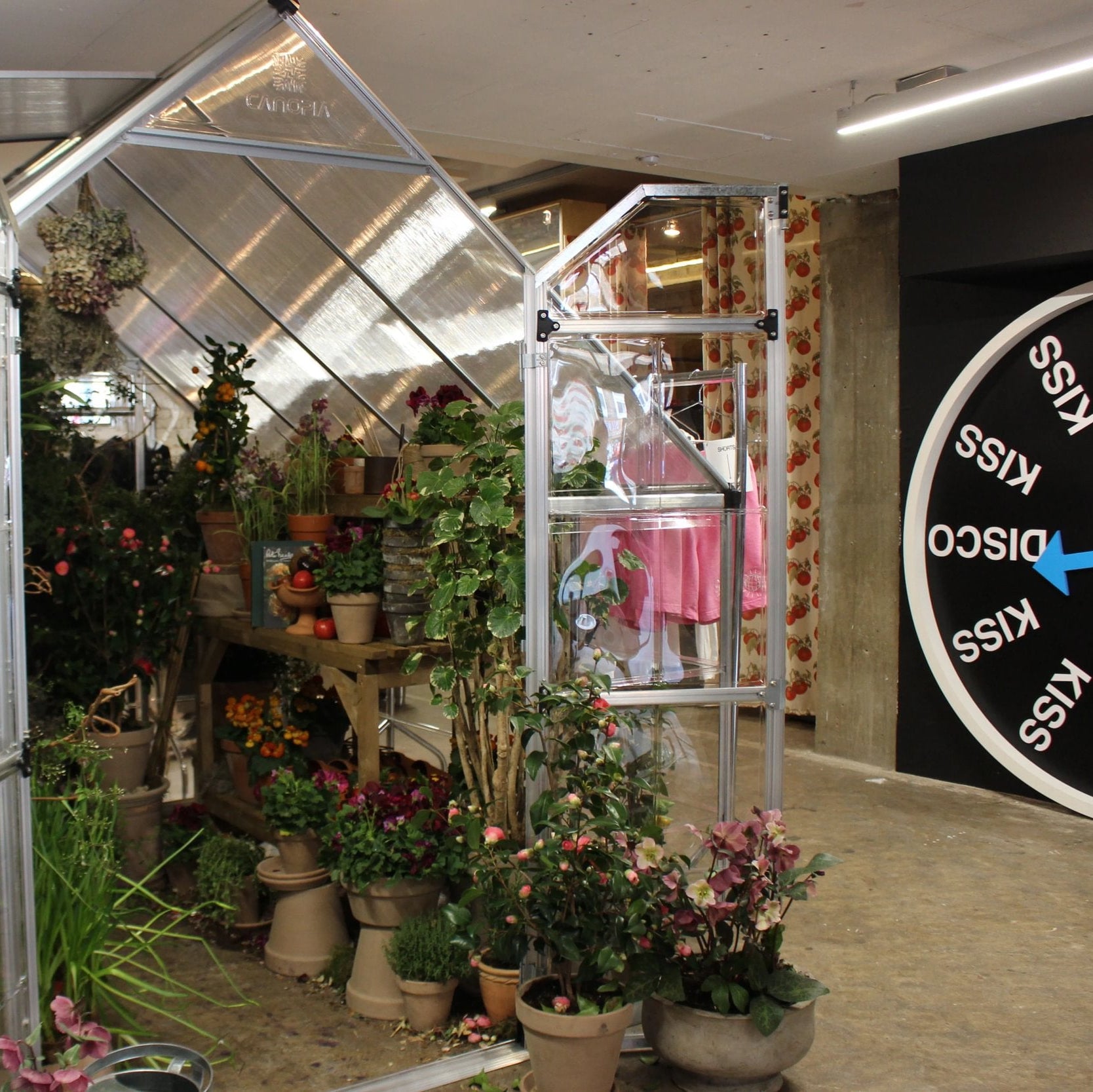 At the centre of the space sat a greenhouse filled with potted plants, tumbling vines and layered greenery.