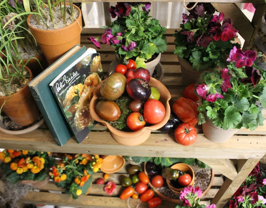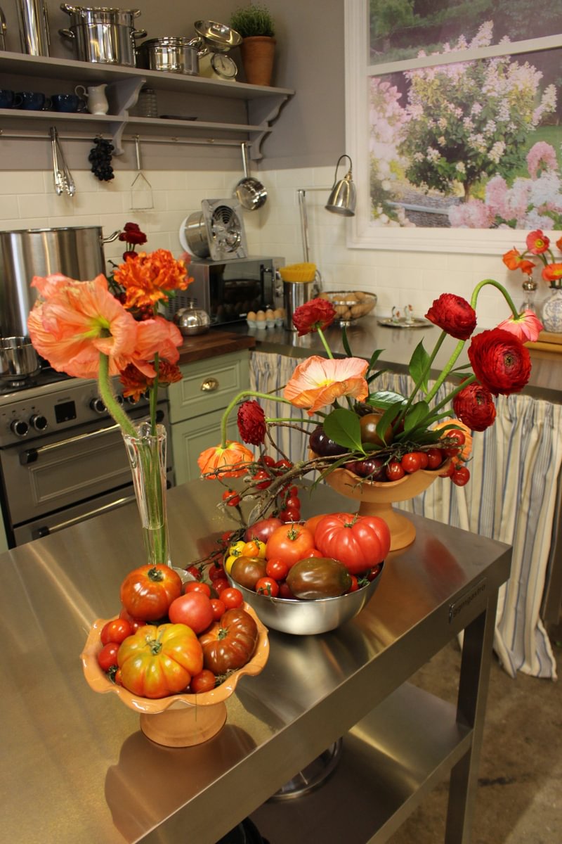 Tables were layered with heirloom tomatoes in rich shades of crimson, amber and deep plum, while delicate poppies and ranunculus brought movement and softness to the scene. Vases, bowls and rustic vessels were arranged to create sculptural still-life moments that felt abundant and slightly whimsical.