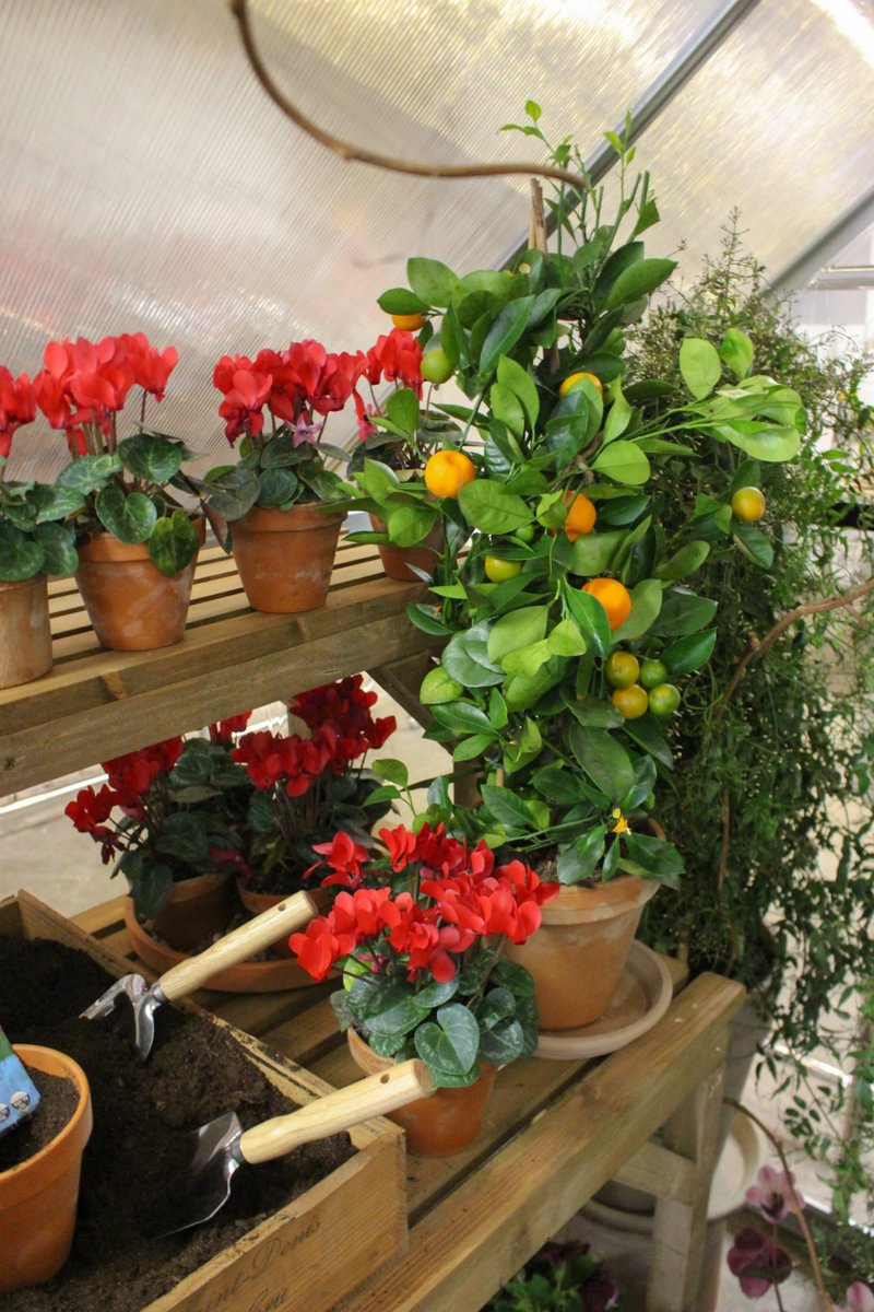 Shelves of terracotta pots held flowering plants, citrus trees and trailing foliage, while watering cans, garden tools and botanical details helped build the illusion of a working greenhouse tucked inside the pop-up.