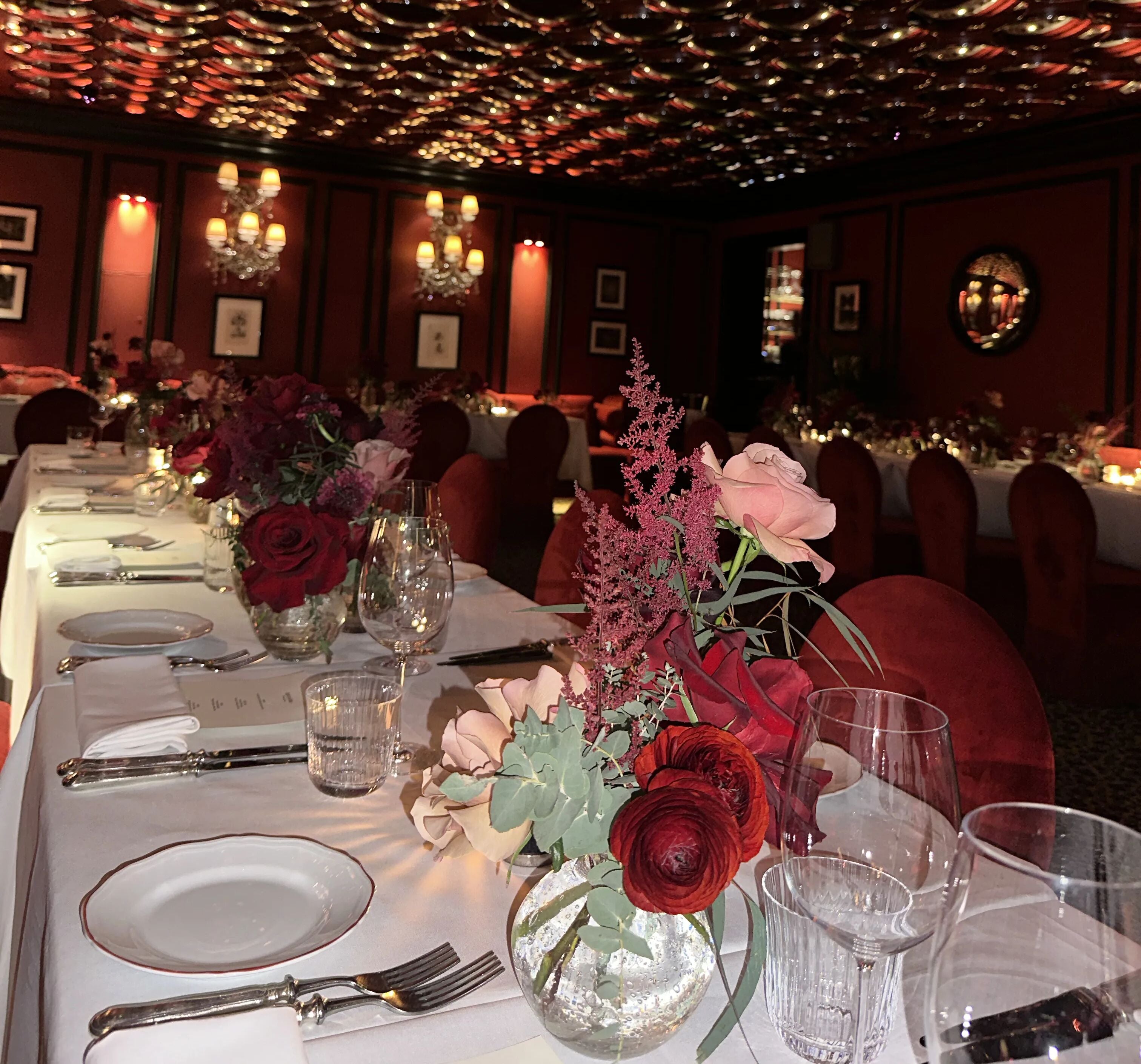 Amidst the refined ambiance of The Twenty Two, an intimate dinner unfolded, adorned with the exquisite beauty of floral artistry. Here at Wild at Heart, we had the honour of crafting a bespoke floral display for this very special occasion, where peach and crimson roses, delicate ranunculus, and astilbe danced in harmony, illuminated by the gentle flicker of candlelight.