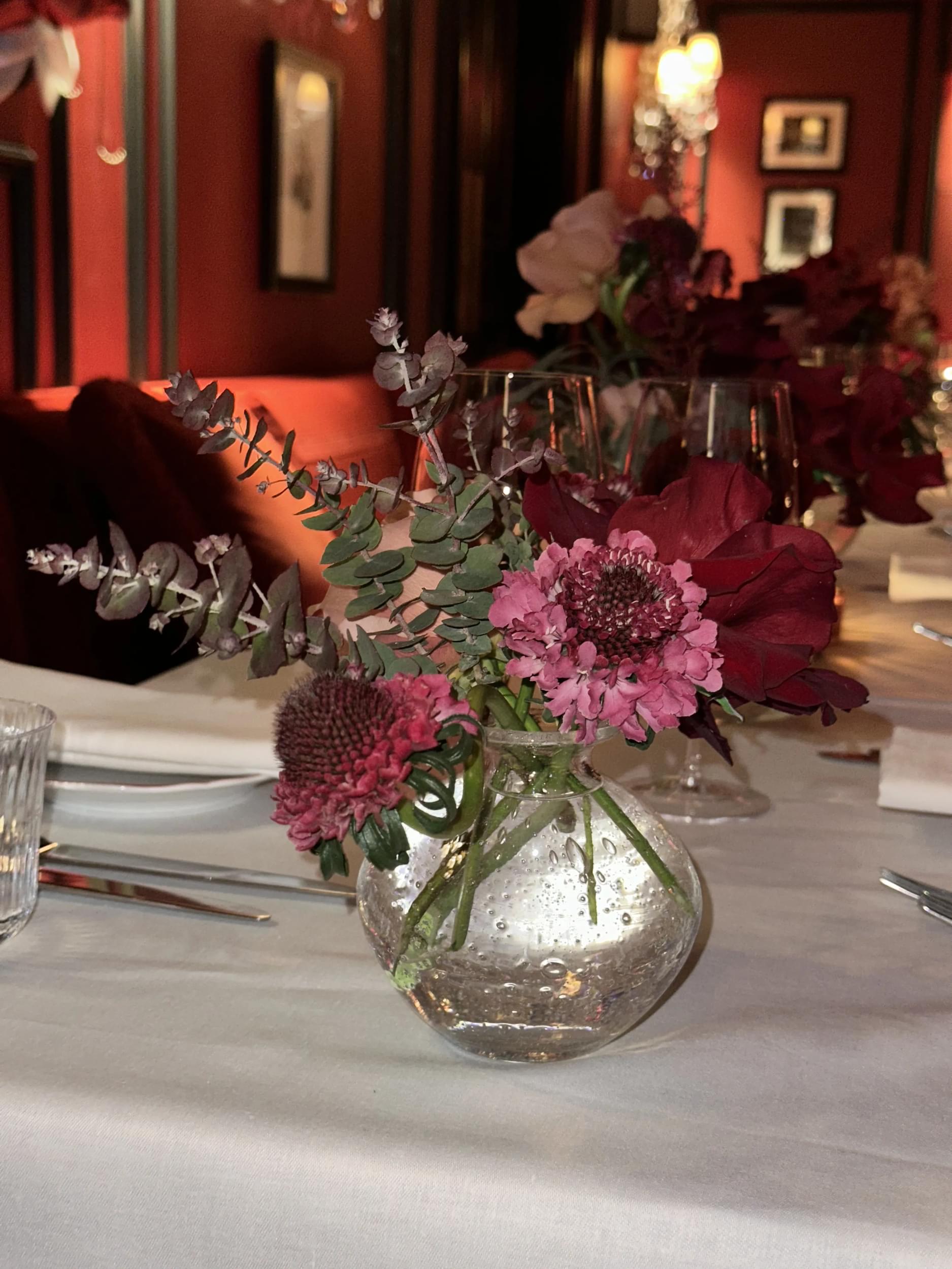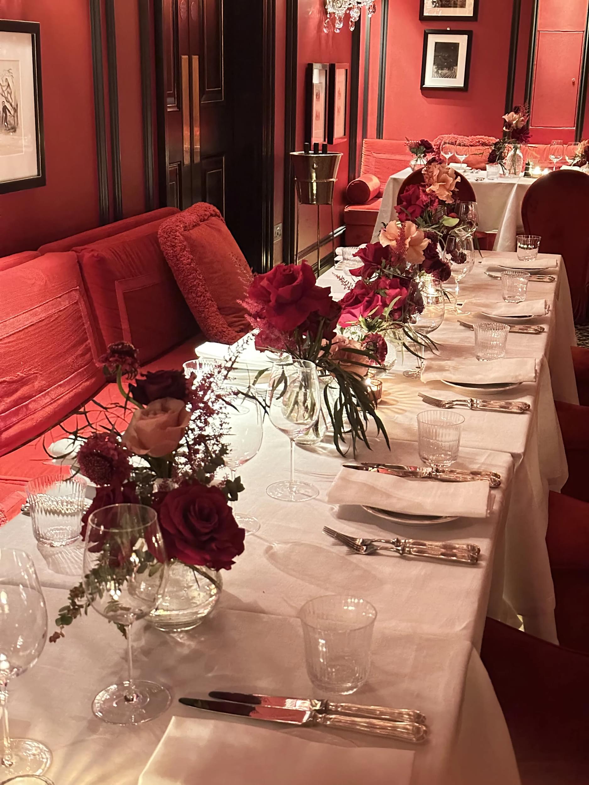 As guests gathered around the table, the air was imbued with a sense of intimacy and romance. Each bloom, meticulously selected and arranged, added a touch of elegance and charm to the soirée. The soft hues of peach and crimson roses intertwined with the lush greenery, creating a splendour that complemented the opulent surroundings of The Twenty Two.