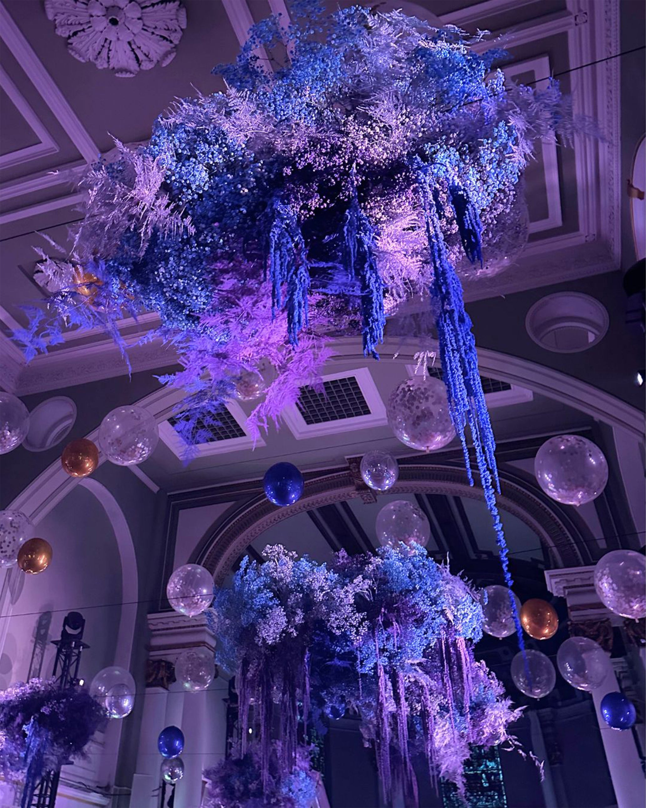 Mirroring the installation on the staircases, more unique floral forms hung from the ceiling downstairs, creating a wonderful sky and backdrop for the aerial performers.