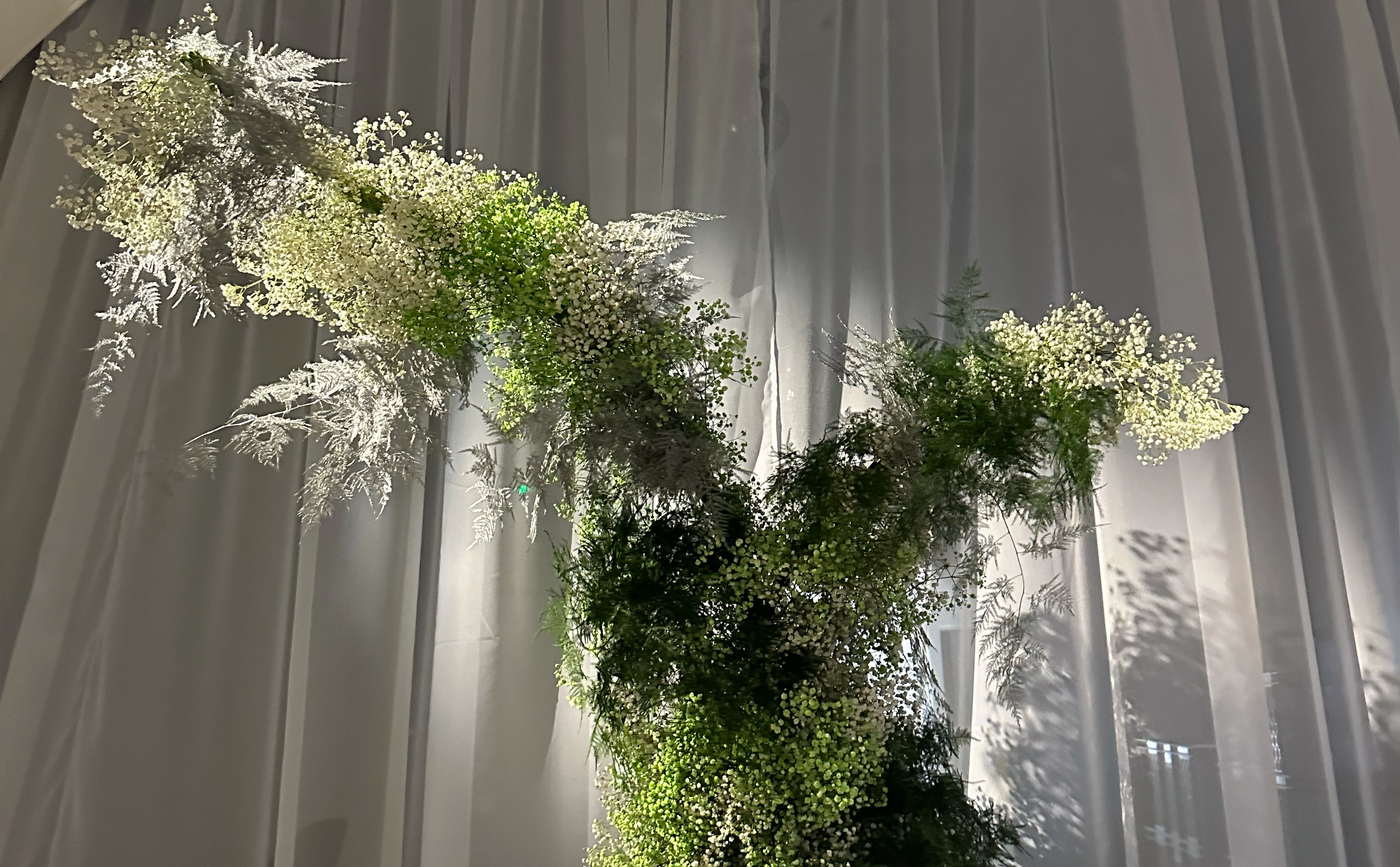 Dressing the dual staircases were ornamental florals strategically positioned along the banister, interspersed within silver orbs, by Bubblegum Balloons. Crafted from gypsophila, asparagus fern, and amaranthus in shades of dark green and silver, these elements combined to bring a monochromatic design, rich in captivating textures and varied designs.