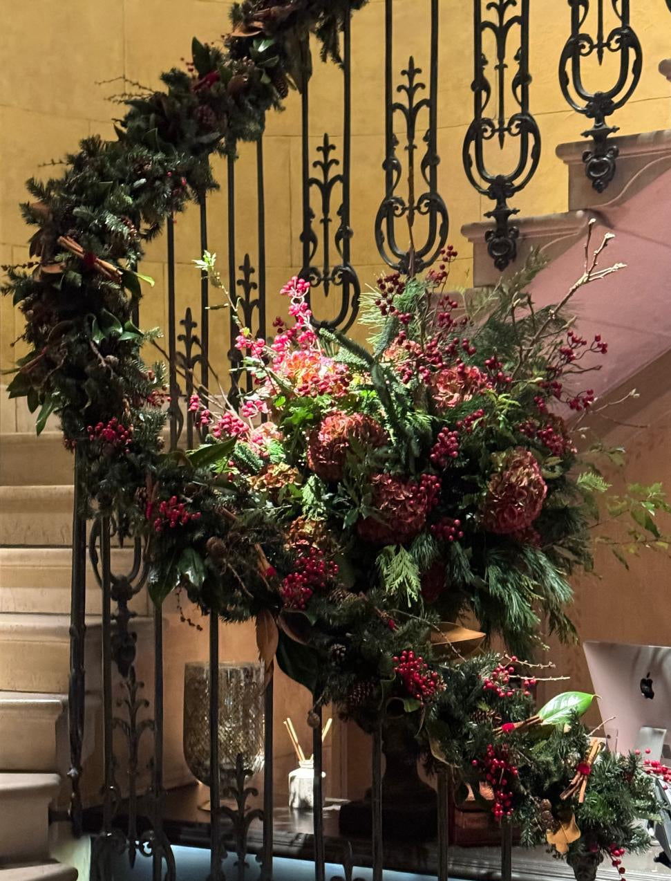 Staircases came to life with dramatic garlands of fir and eucalyptus, accented with golden touches. These cascading designs provided a spectacular festive welcome.