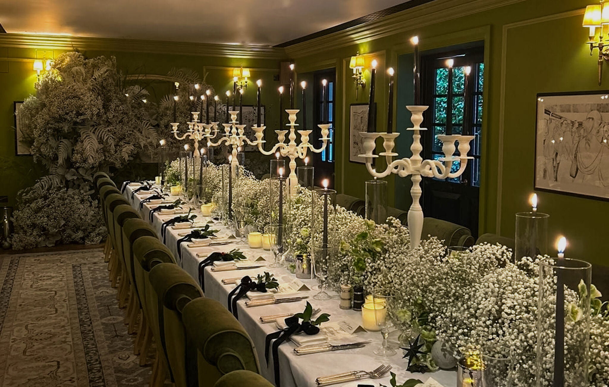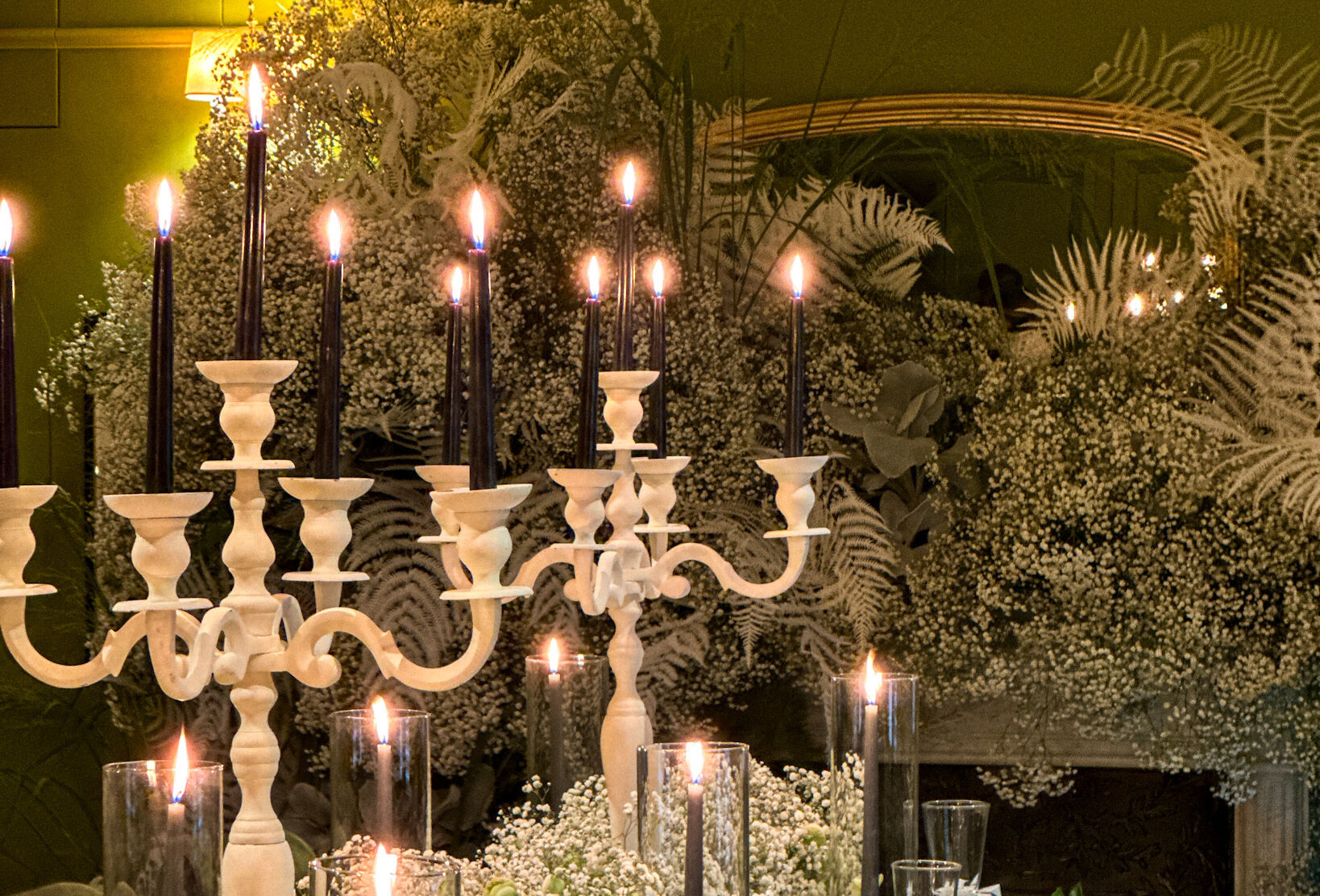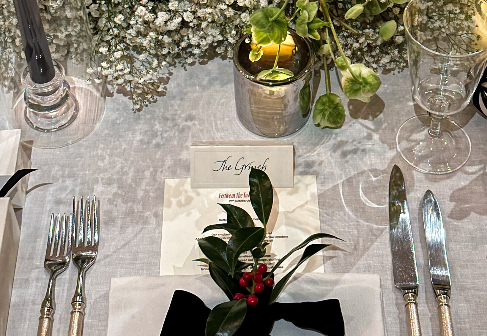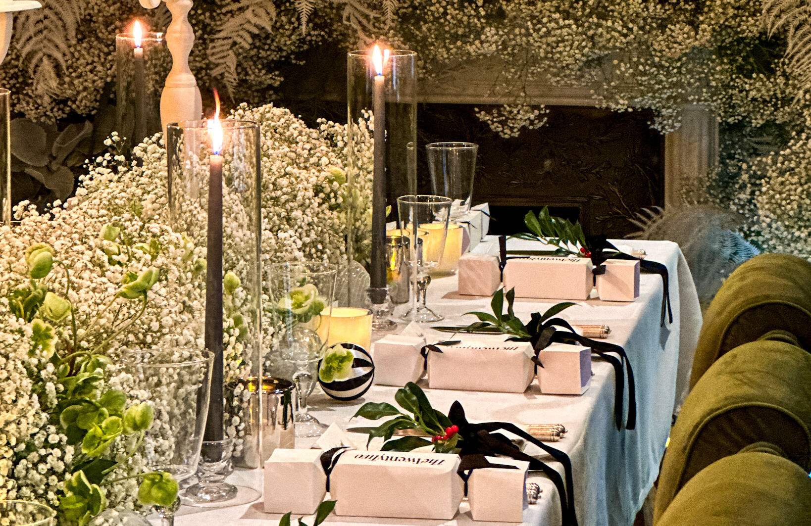Those delicate gypsophila flowers wove their magic as they decorated the fireplace, casting an ethereal glow that captured the essence of the season. The tables, laden with the abundance of gypsophila, were a visual feast, accompanied by flickering candles that added a warm and inviting touch to the festivities.