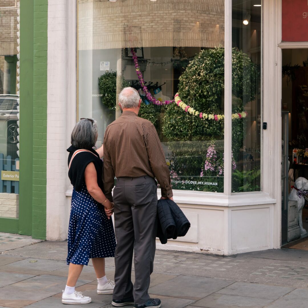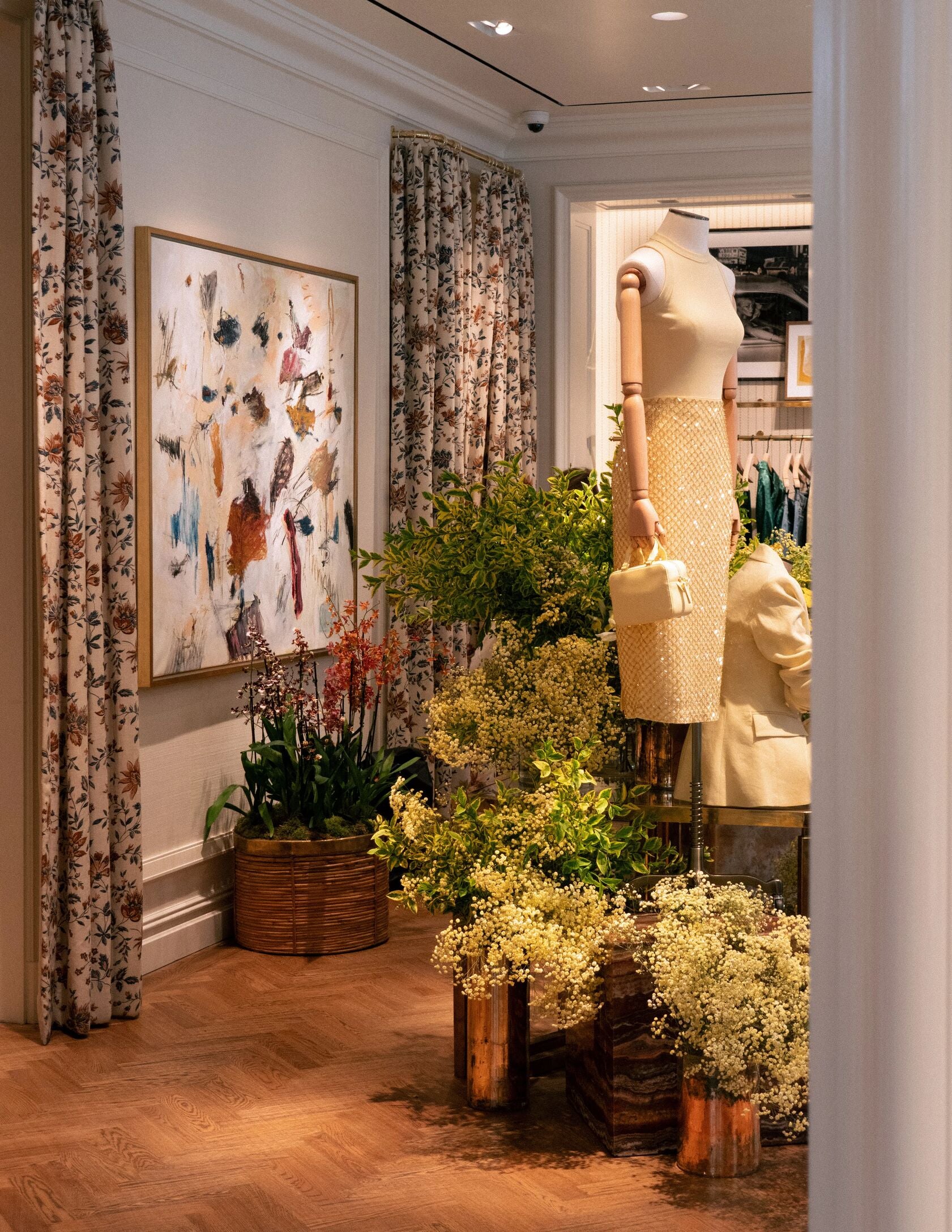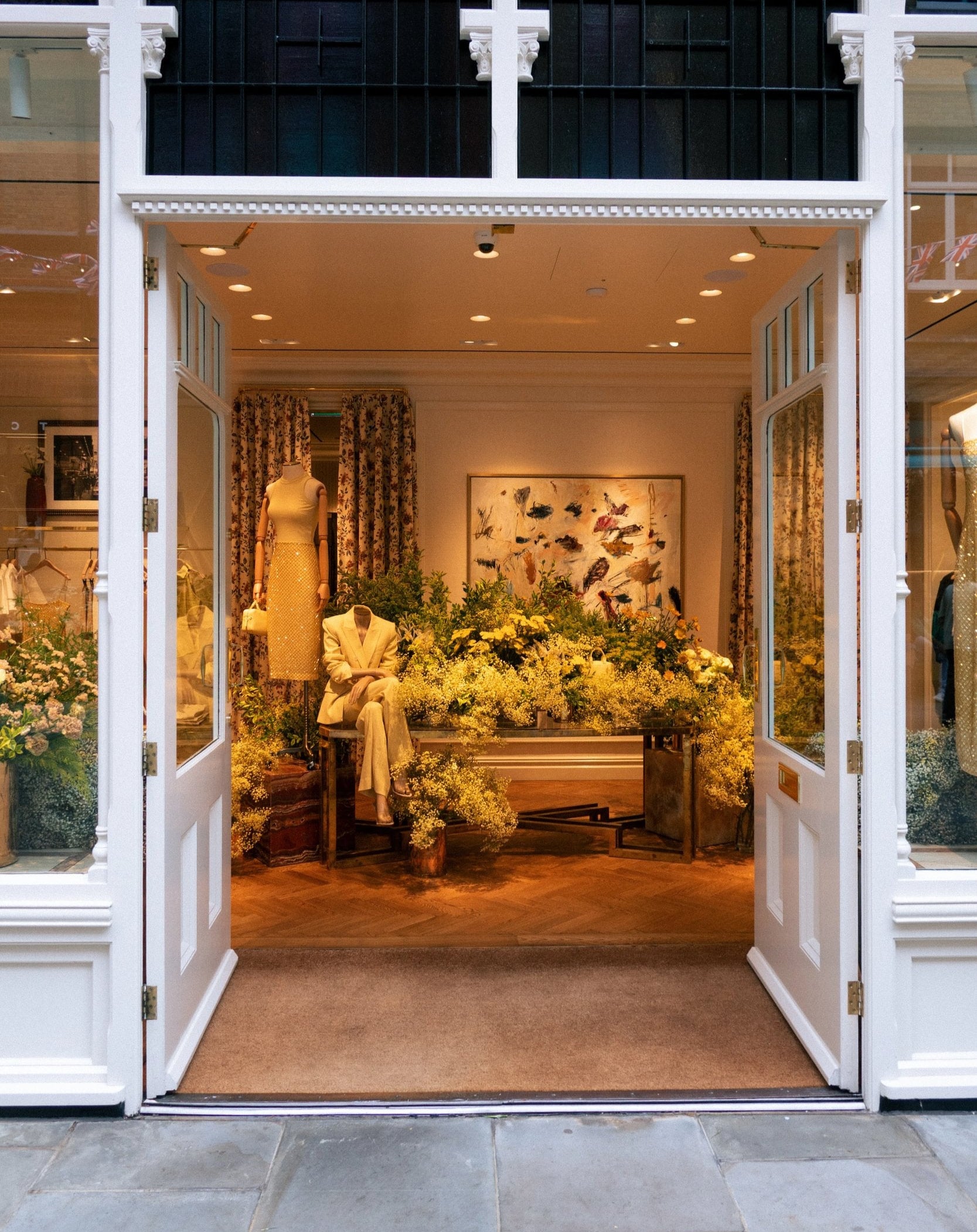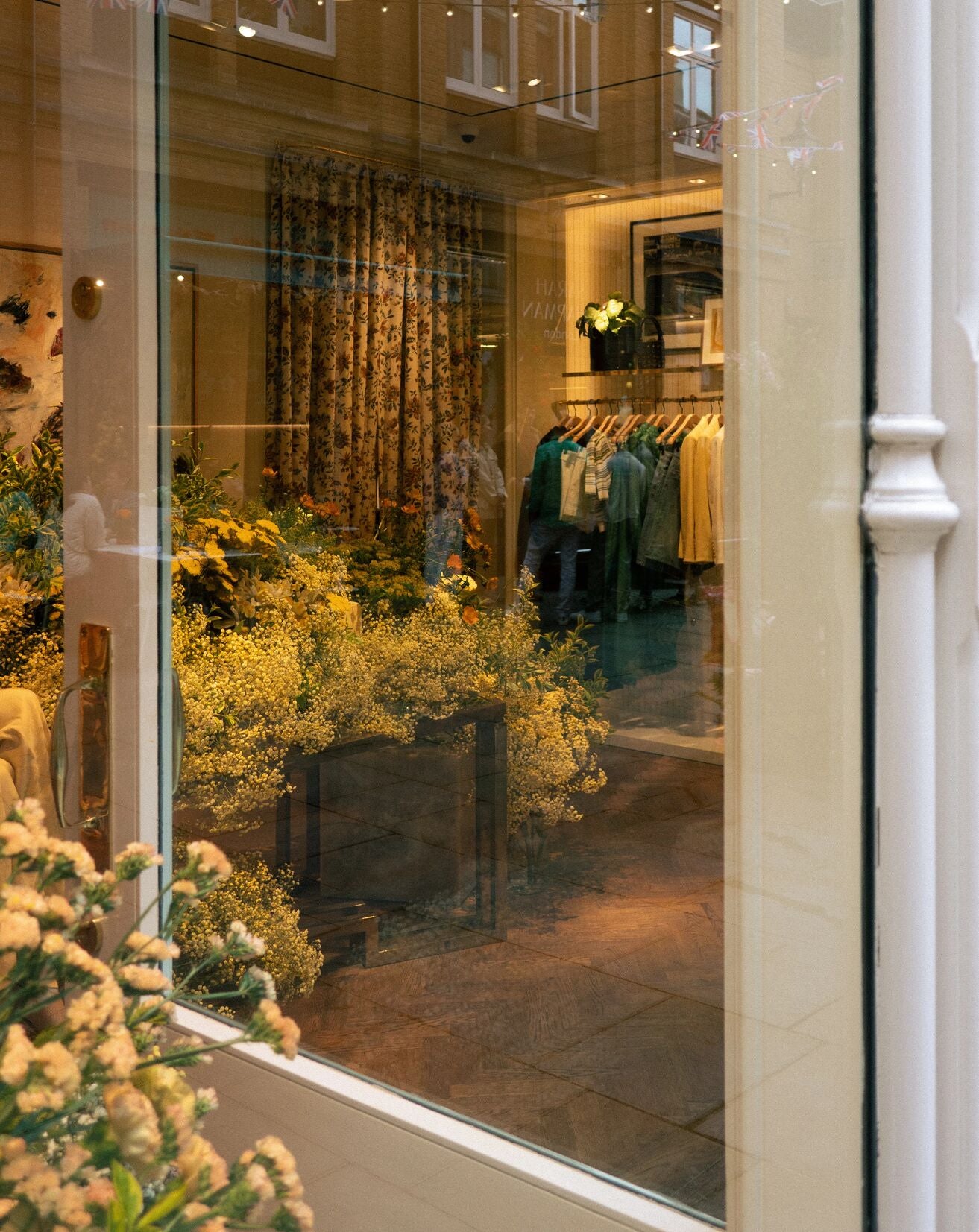 Each window became a curated reflection of the garments it framed: delicate flowers mirrored textile patterns, and colour palettes were echoed in petals and stems.