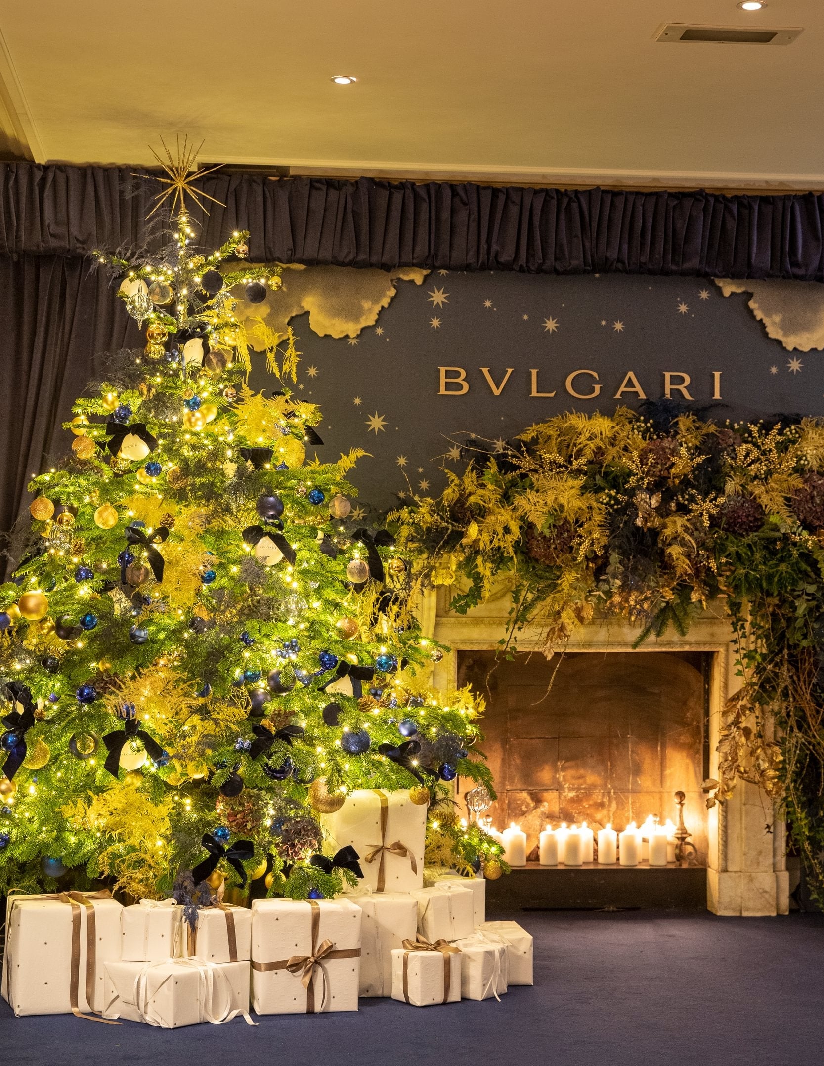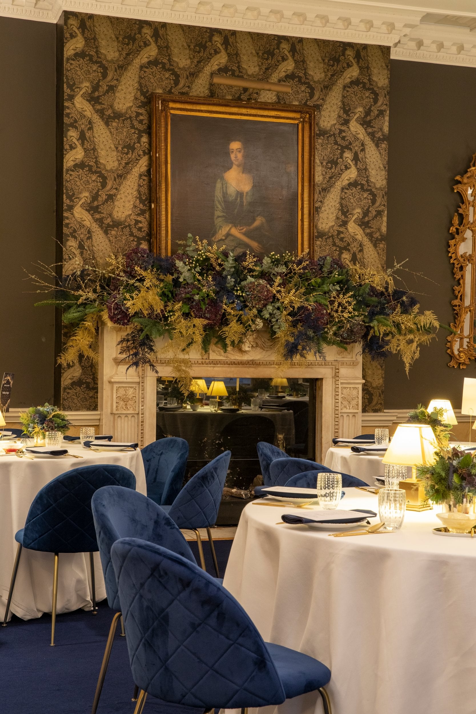 As guests entered the venue, they were greeted by a striking asymmetric overgrown garland at the fireplace. Created with a mixture of seasonal pine and masses of navy blue pimpernel hydrangeas, gold pine cones and soft white fern, tumbling down to provide the perfect photo backdrop. To the left of the fireplace was a spectacular 9ft Christmas tree, placed in a gold pot, dressed with warm white lights and plenty of navy blue & gold tone baubles and piles of gift wrapped presents placed under the tree.