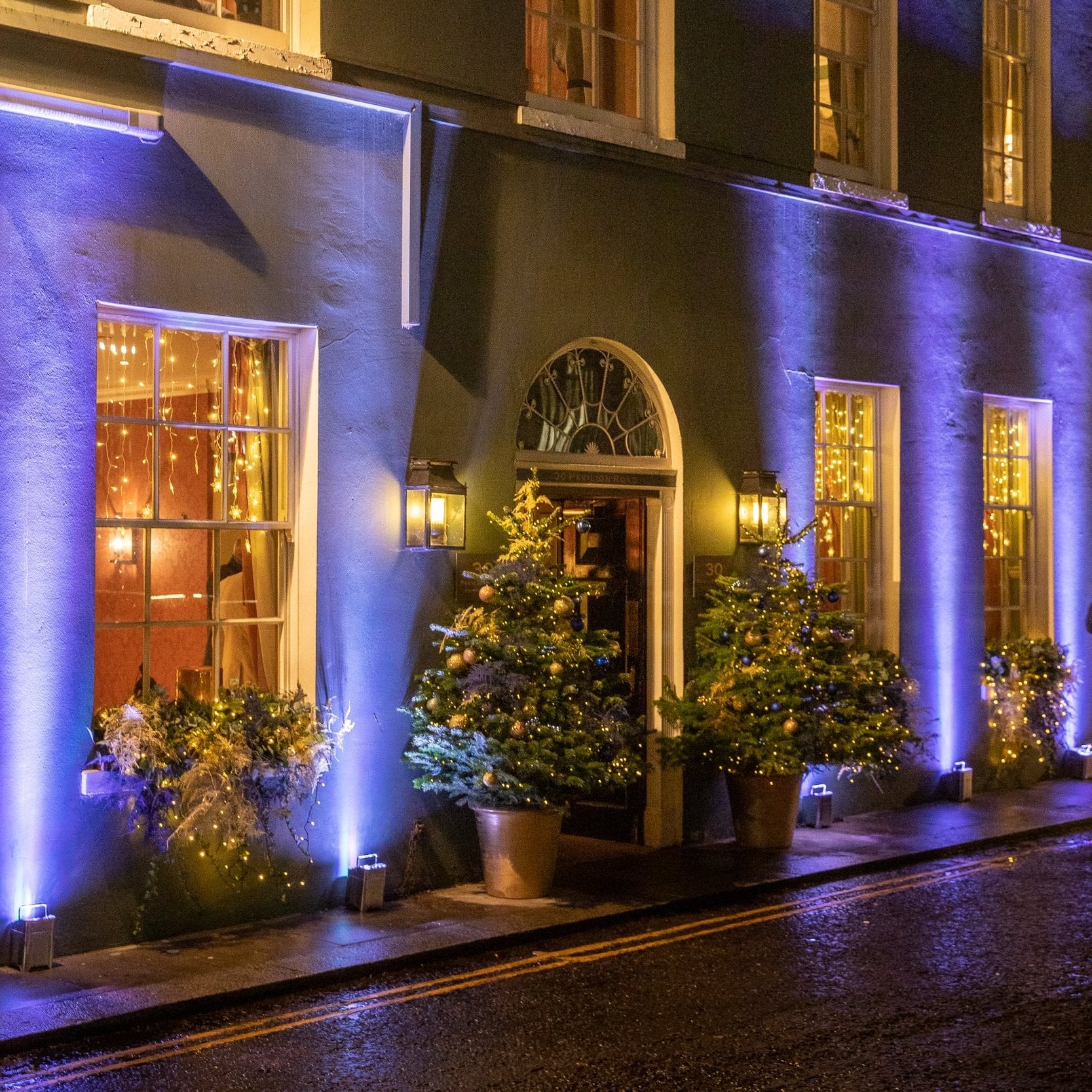 Welcoming the guests at the entrance to the venue were two Christmas trees standing in golden pots. The trees dressed with warm white lights, gold and navy blue velvet bows with an elegant gold star at the top of each tree - creating the perfect Christmas entrance.