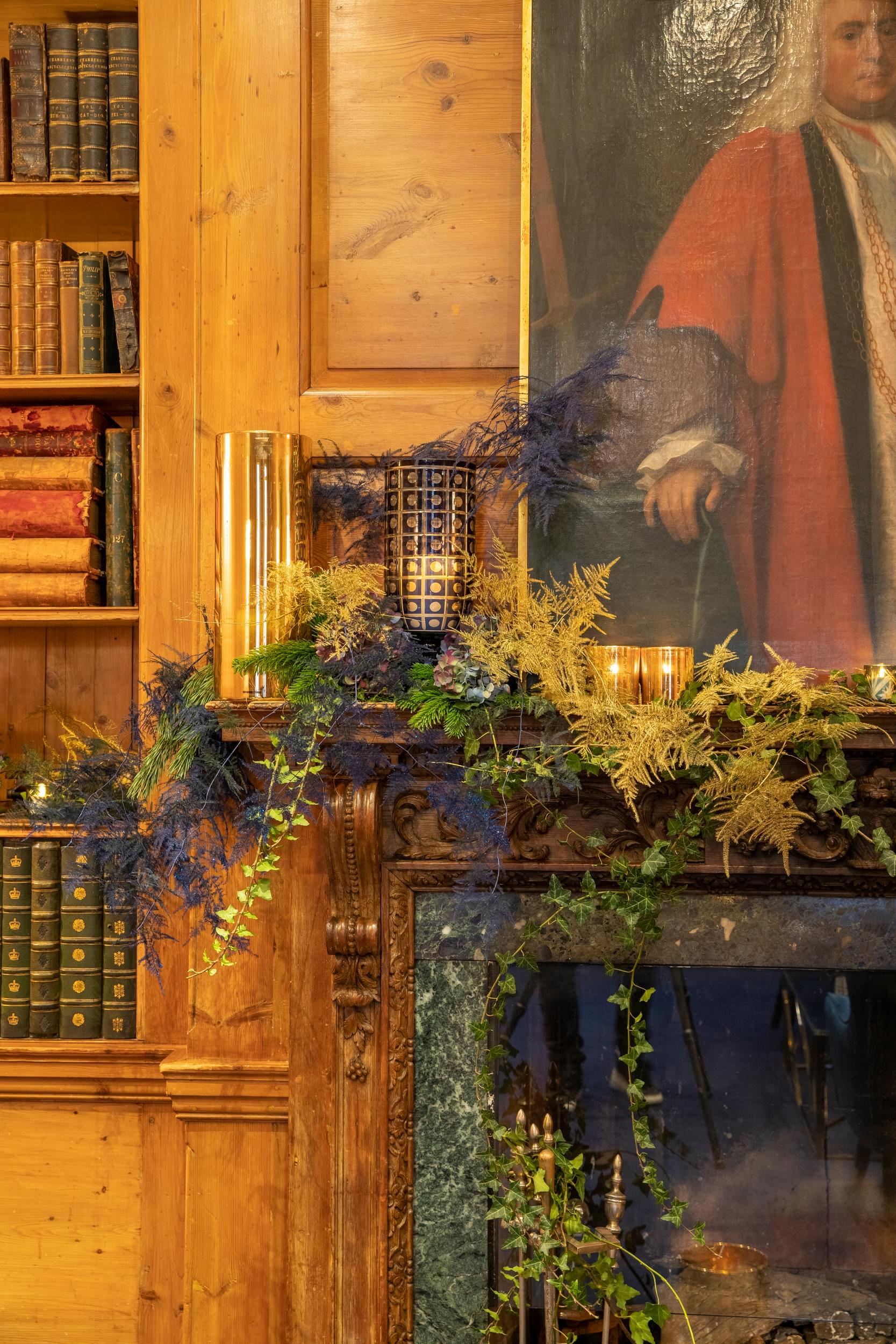 Keeping with the style throughout the rest of the venue, the tables were dressed with low arrangements, mixing seasonal pine, eucalyptus and glistening golden foliage, creating a cosy flowerbed for the cake stands. To tie in the rest of the room, we placed another garland on the fireplace in the dining room, full of mixed pines, glistening golden foliage and golden branches with hints of soft white asparagus fern to perfectly compliment the dining tables and bring an element of enchantment to the room. Our fabulous team are still available to decorate your home this Christmas or transform your upcoming dinner party.