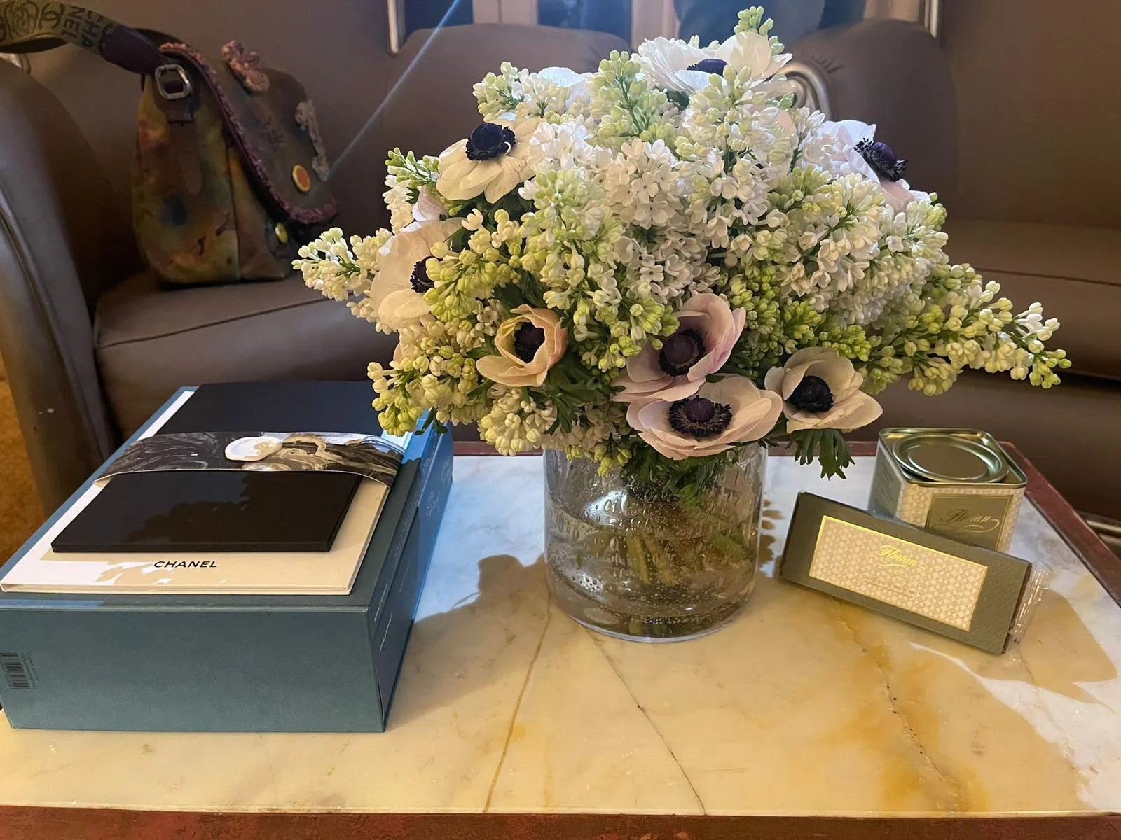 Dressing the dining table was an eclectic collection of vases filled with beautiful arrangements of flowers in abstract, playful and beautiful compositions. The flowers included beautiful white anemones,ranunculus, gypsophila , ginesta and cameilia.