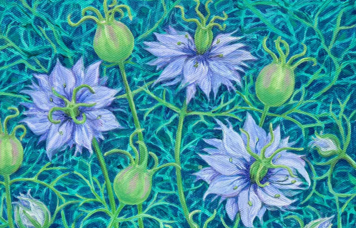 Nigella is also known as ‘love in a mist’ as the flowers are supported by a thread-like leaf structure, known as a ruff, giving the appearance of the flowers being surrounded by a mist.