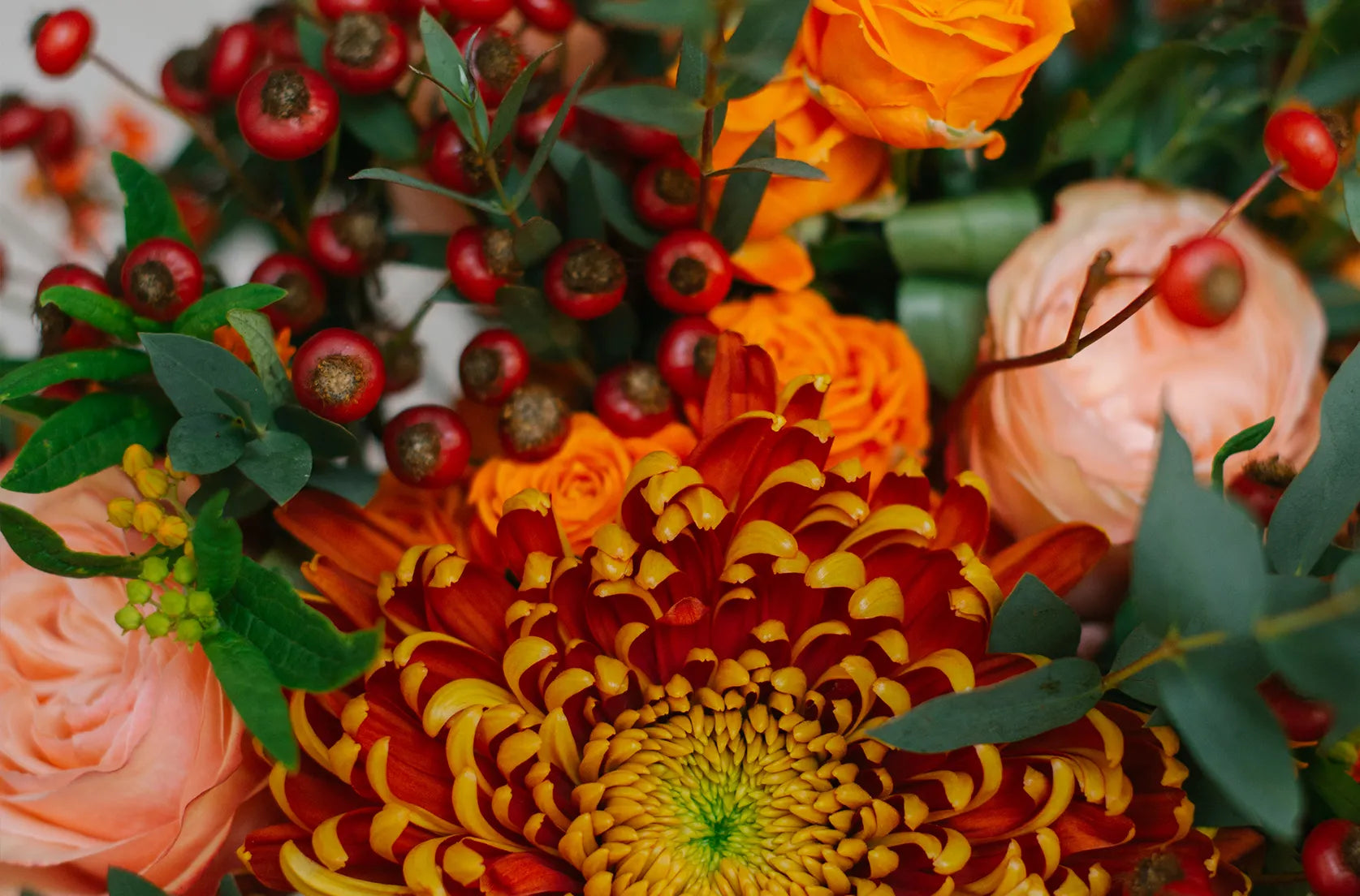 Rosehips add the perfect touch to autumn and winter bouquets. Their delicate colourful berries create texture and beauty and are a wonderful filler between large flowers.