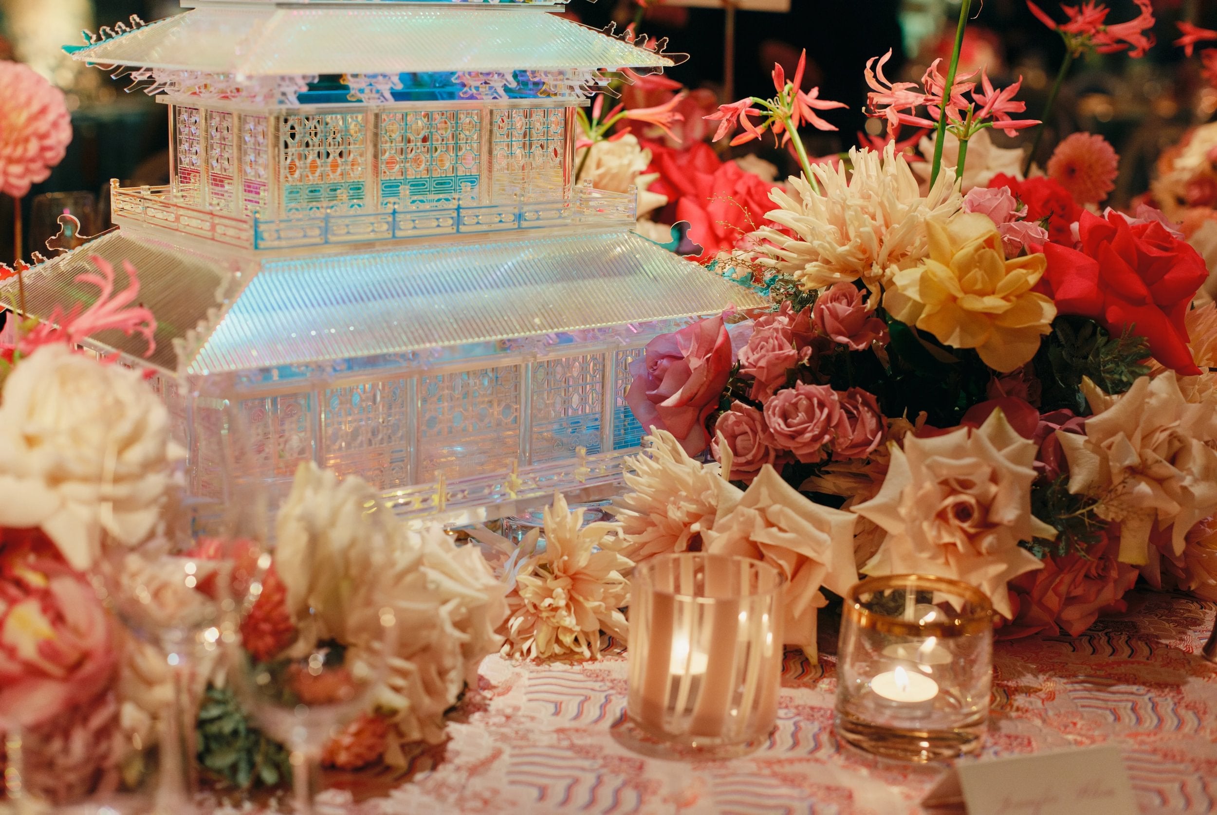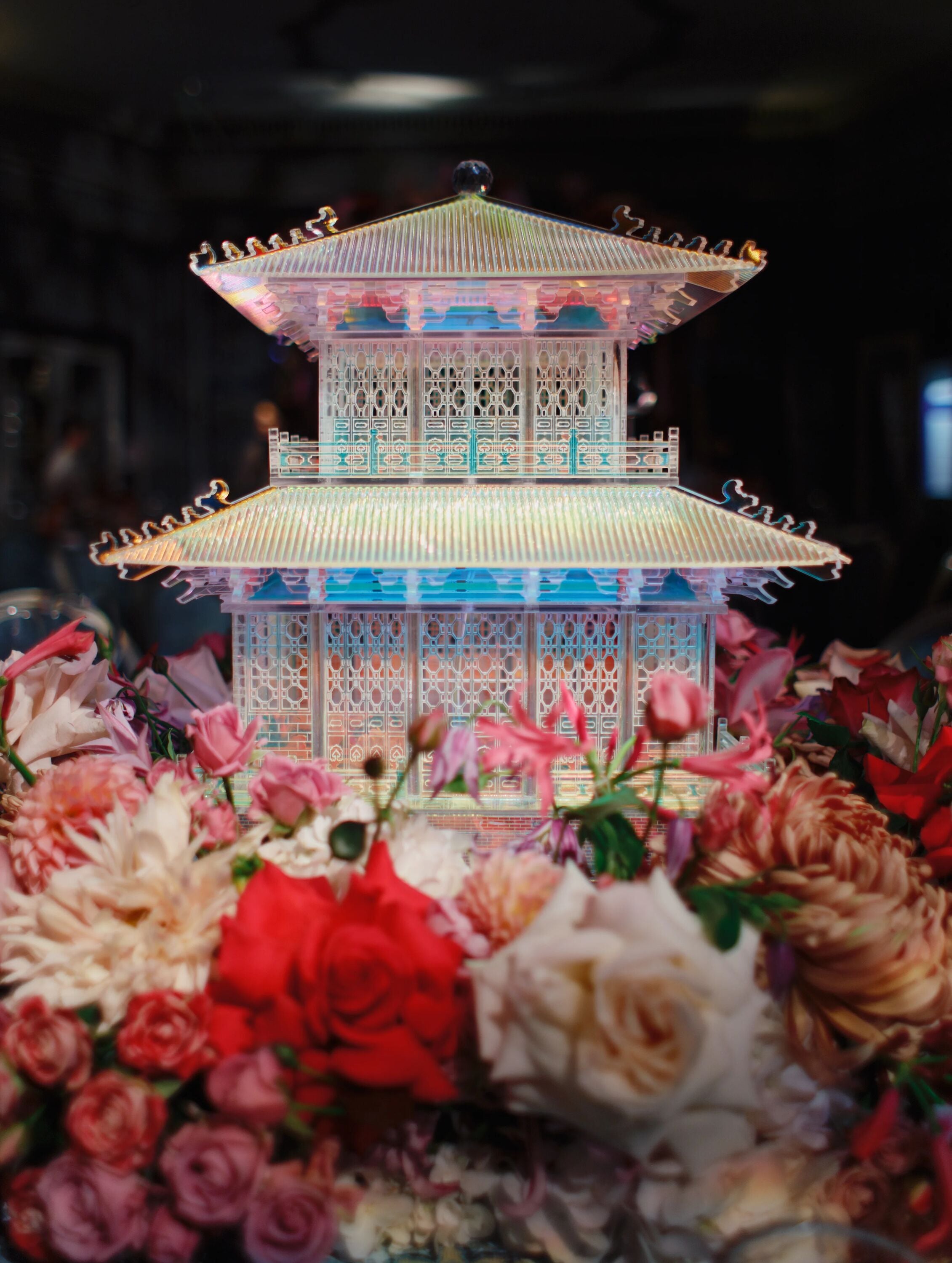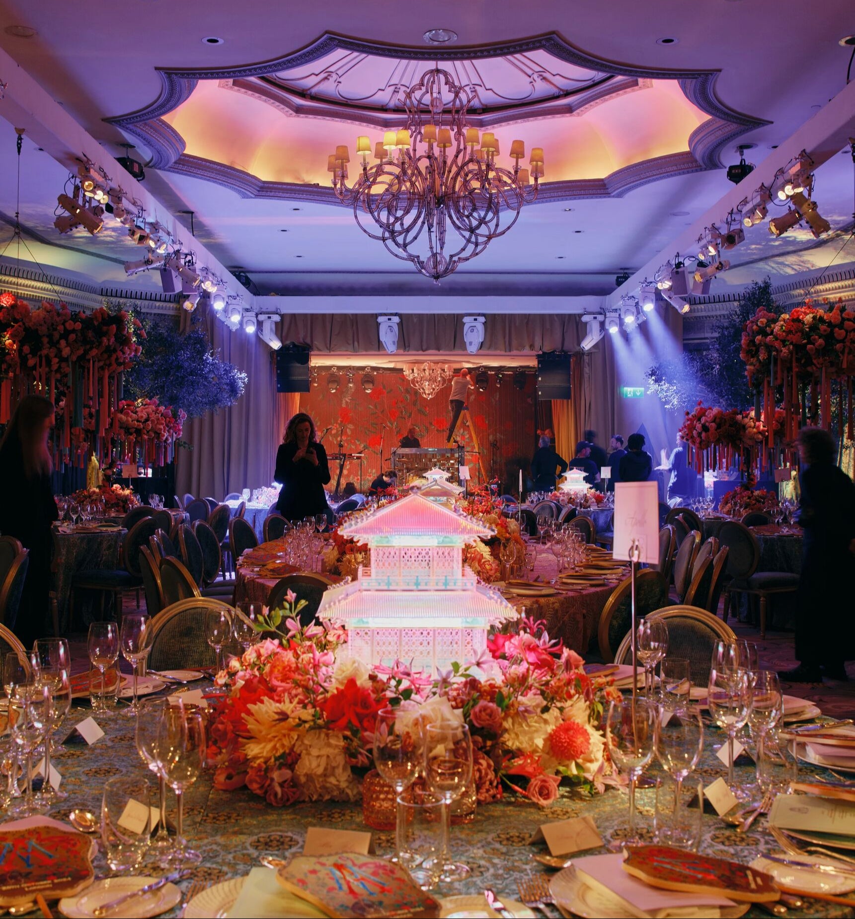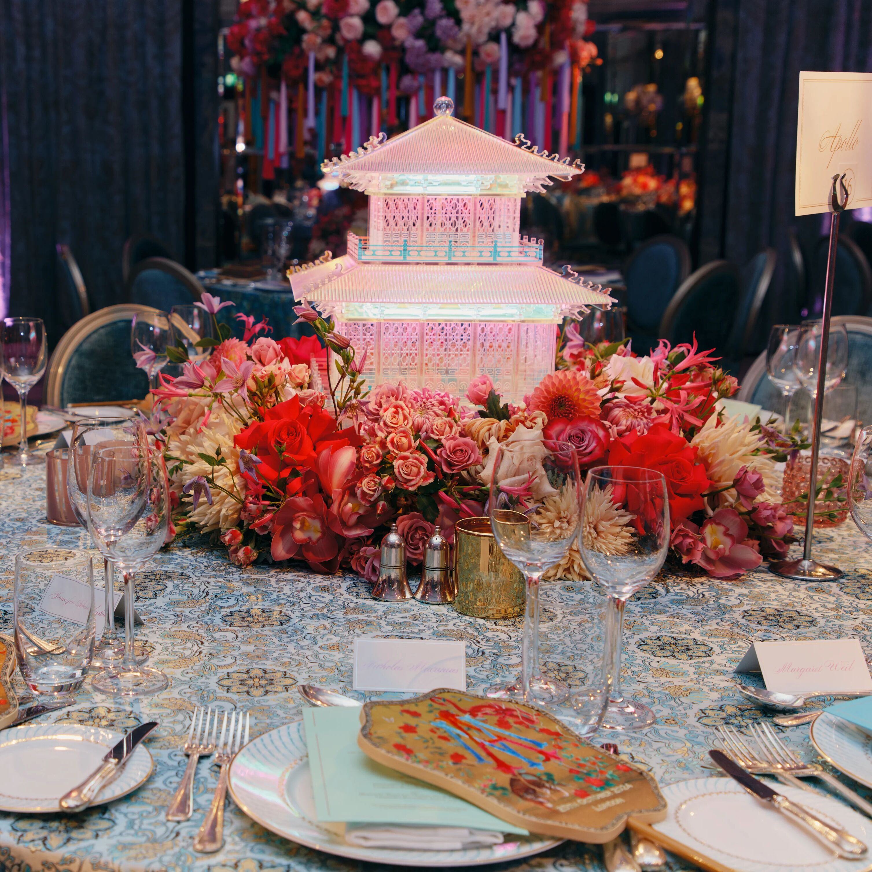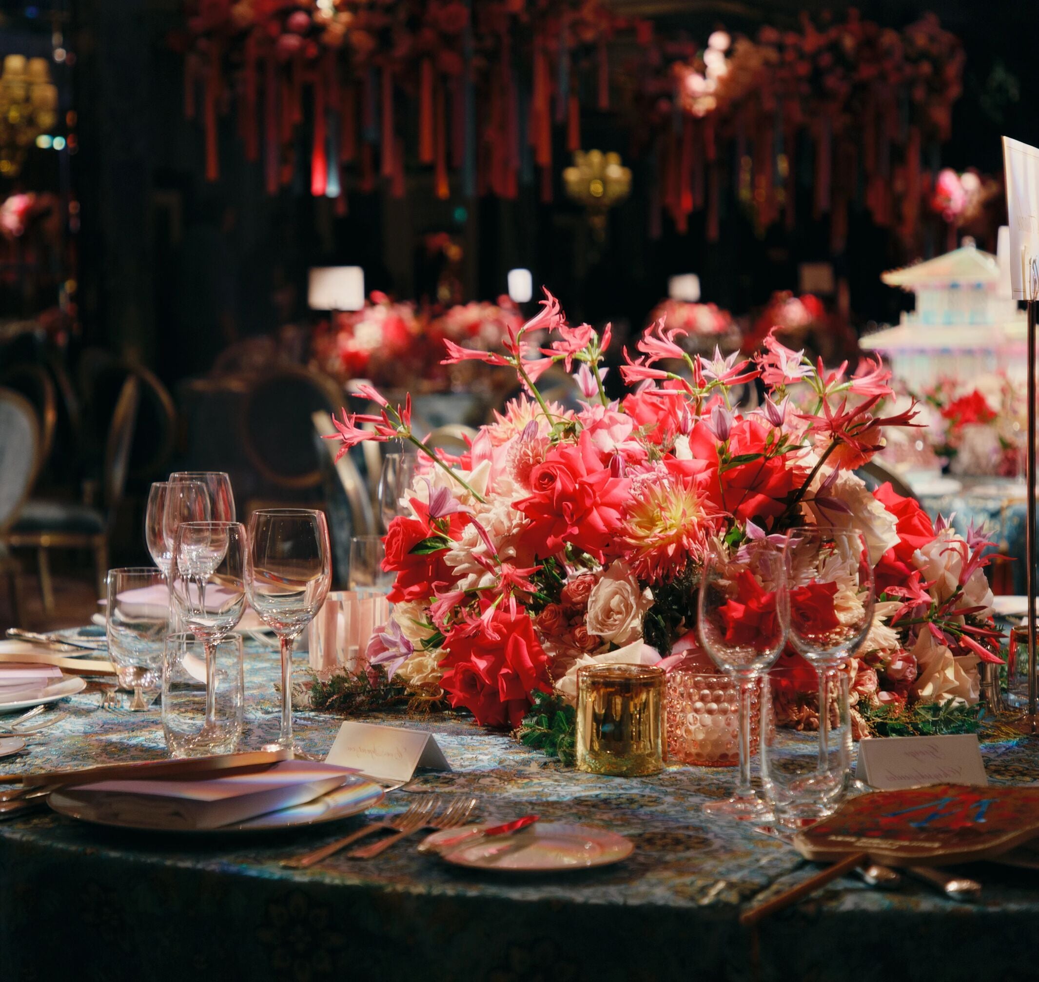 The botanical journey continued on the dining tables, where delicate meadow moments sprang to life around the Chinese houses. Each table blossomed with vibrant, ombré floral arrangements, from soft blush to deep hot pinks. These blooms, reminiscent of a flourishing garden, grew up and around each setting, creating miniature landscapes, evoking the feeling of a wild paradise.