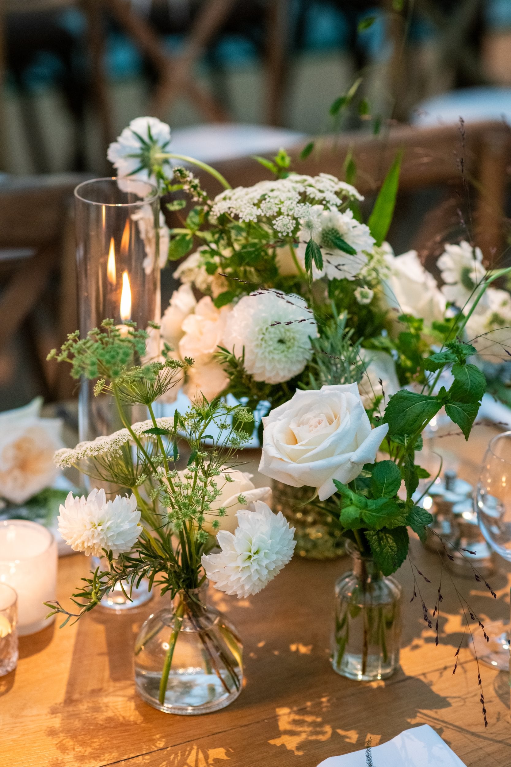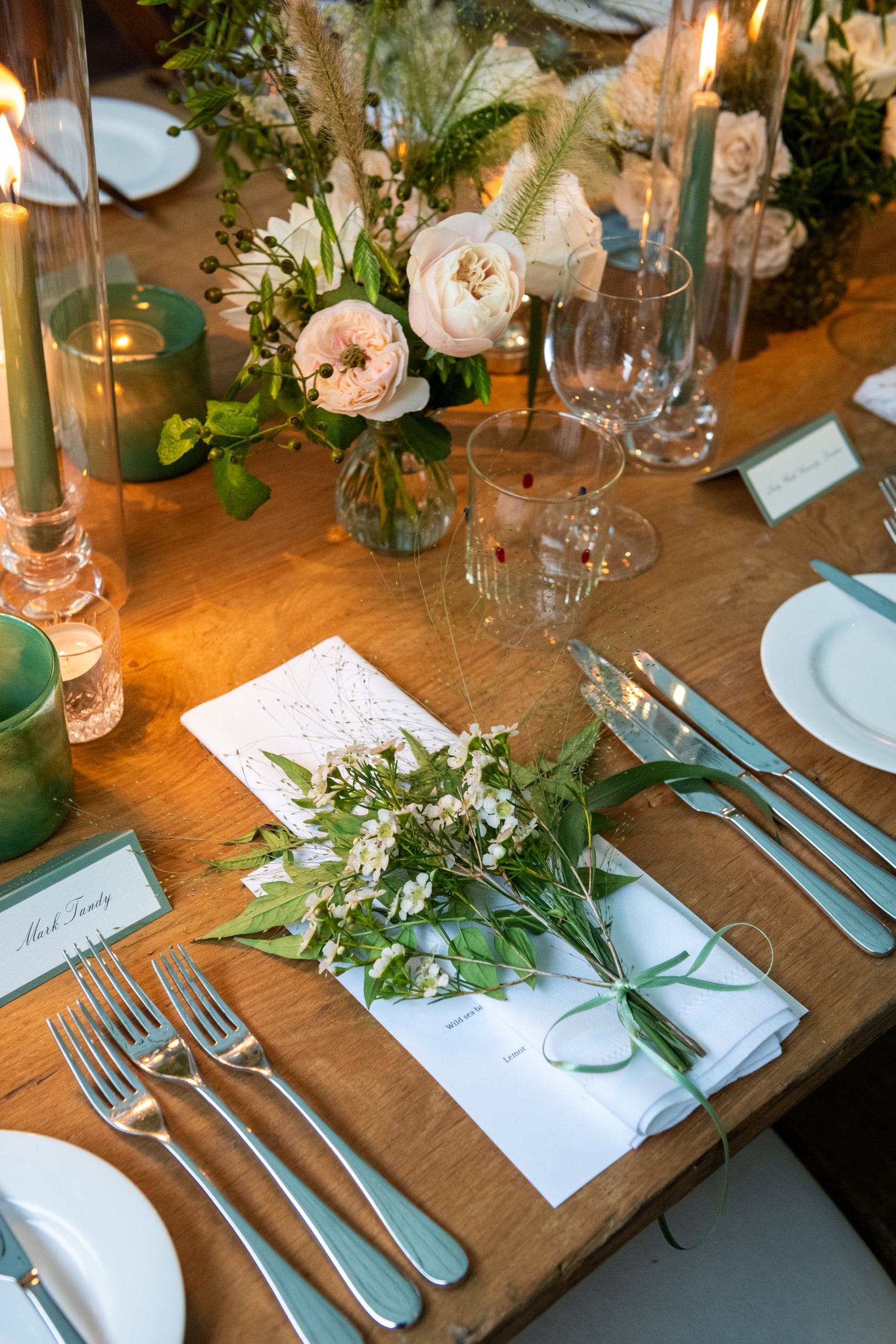 When it was time to dine, the tables were transformed into a garden-inspired dream. Green glass bud vases, along with cream and terracotta ceramic pots, held arrangements of late summer flowers—roses, dahlias, cosmos, Japanese anemones, guelder roses, and, of course, plenty of grasses and herbs. The flowers, in soft tones of white, cream, and green, flowed out of the vases, with trailing foliage that pooled onto the tables, creating an enchanting, overgrown aesthetic.