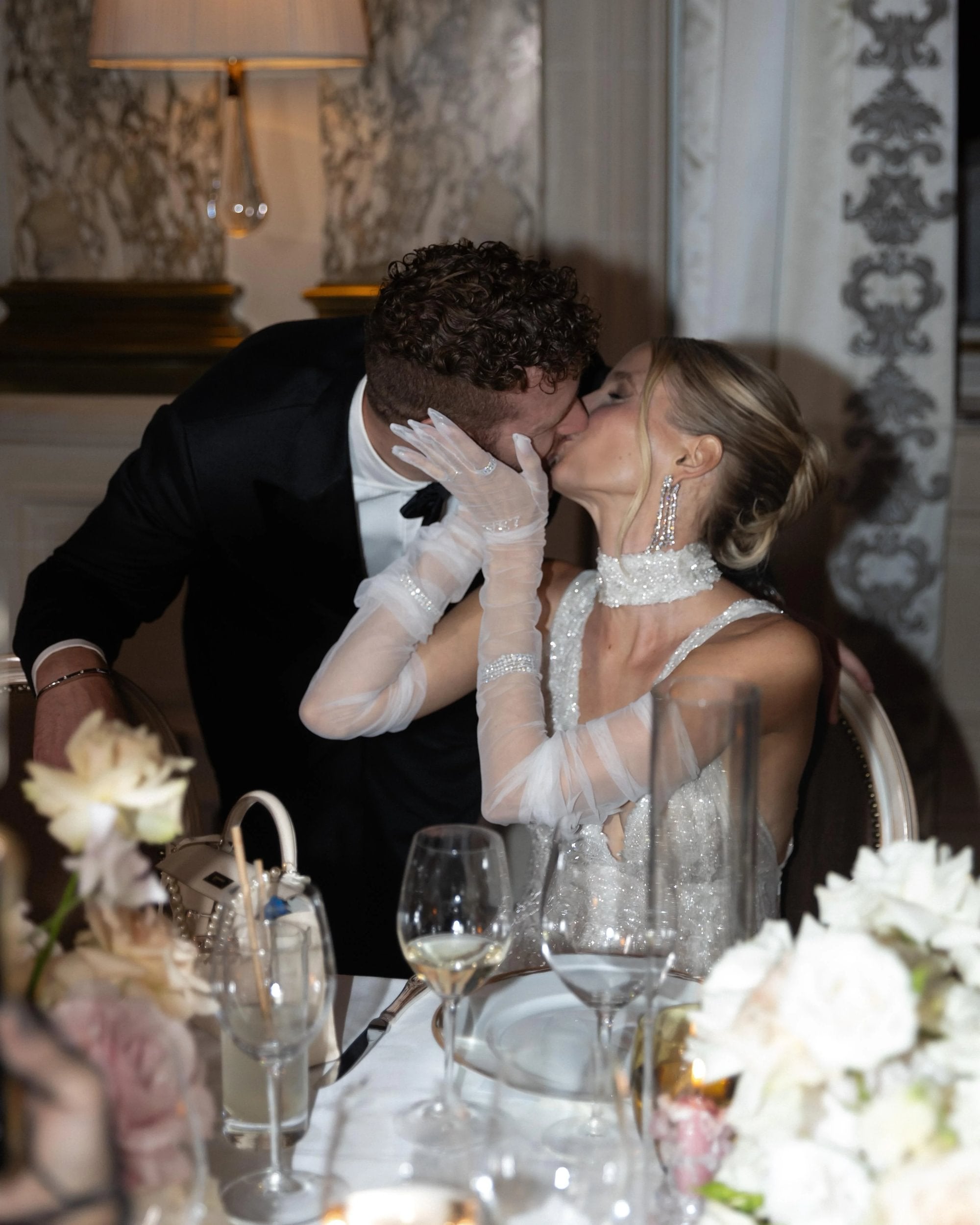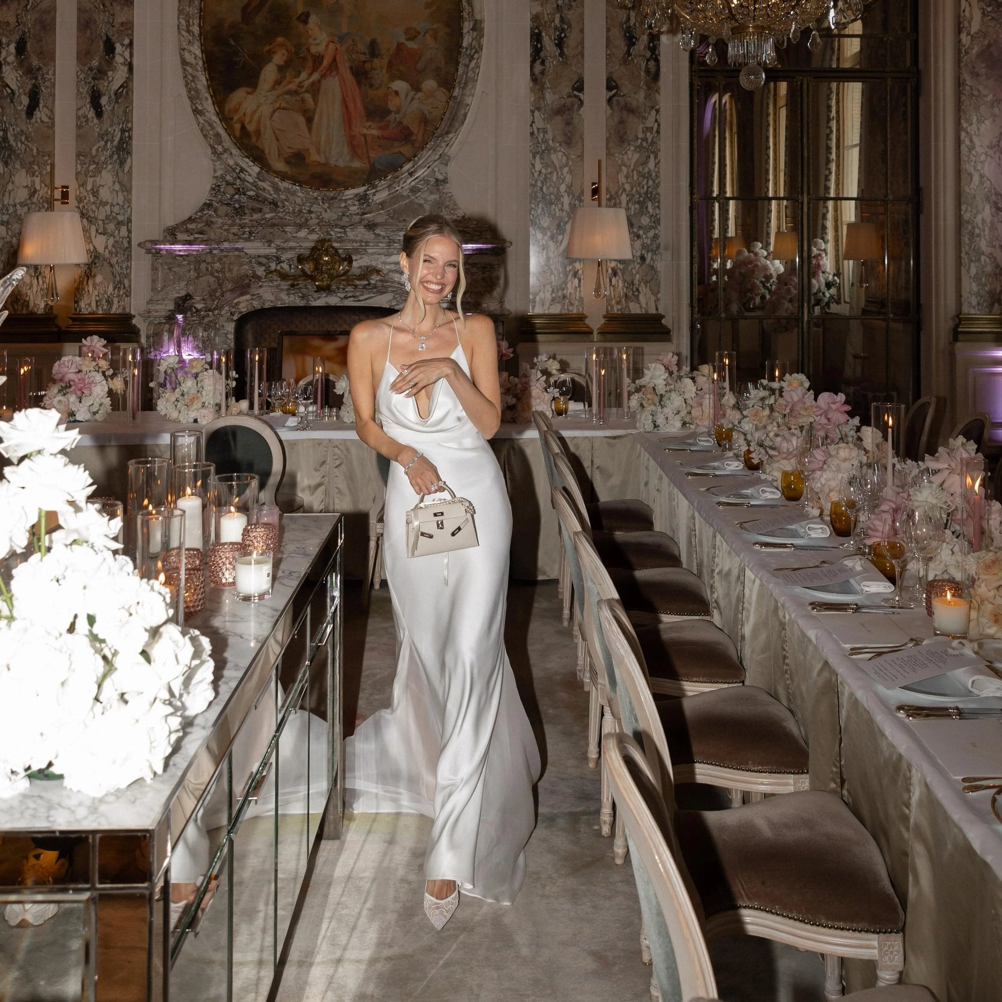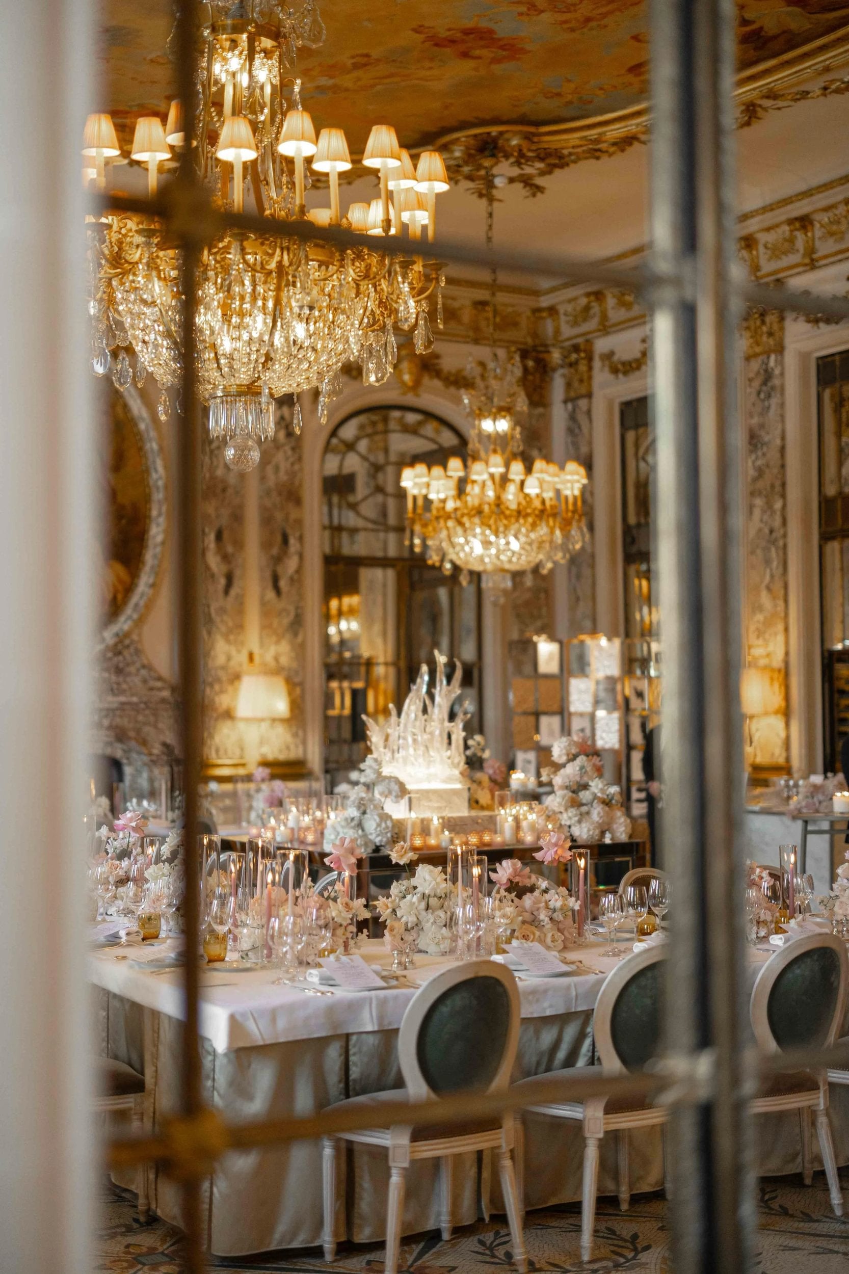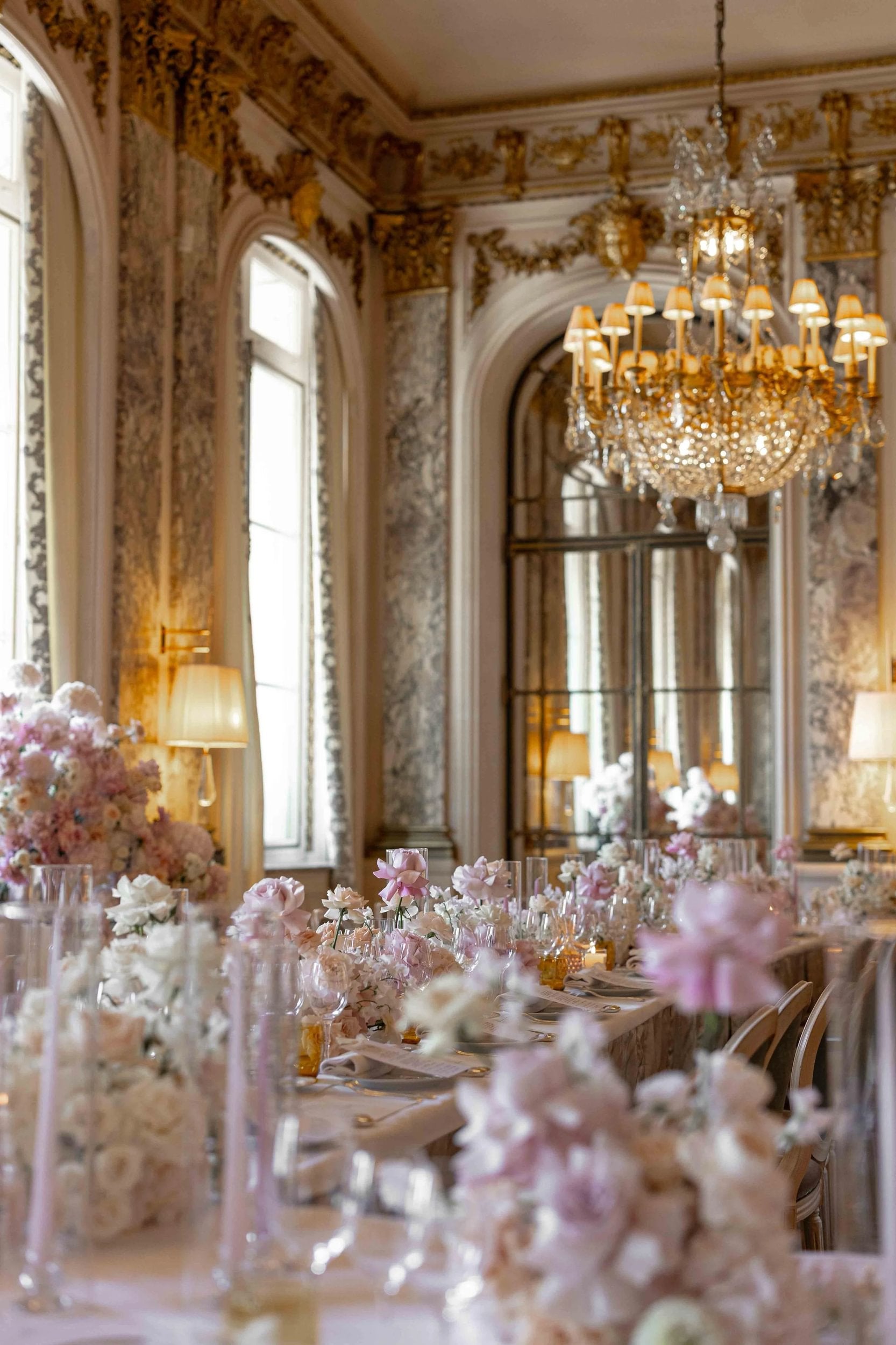 Set within the gilded grandeur of Le Meurice’s Salon Pompadour, the scene was transformed into a romantic dreamscape, where thousands of flowers cascaded across mirrored tables and down onto the mosaic floor below. Every petal, every candle, every handwritten detail came together to create an atmosphere of pure enchantment.