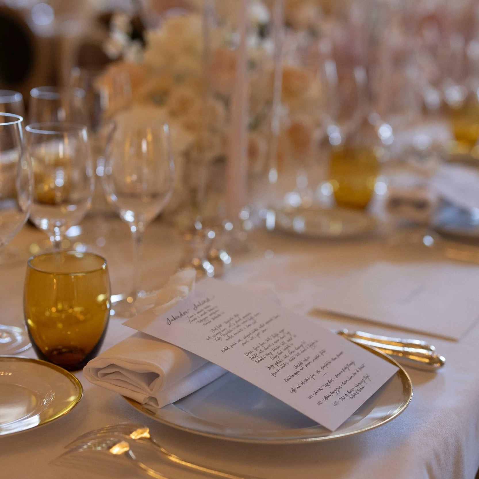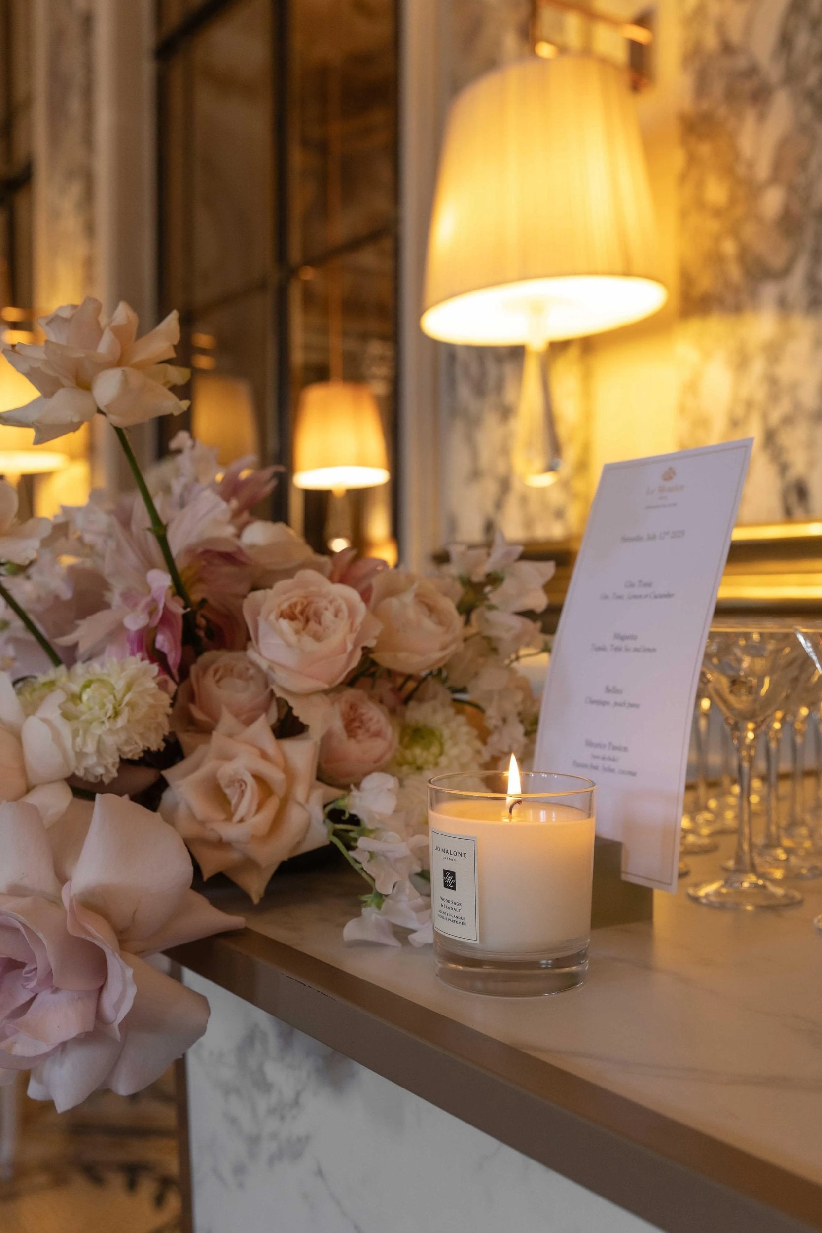 From bespoke calligraphy menus tied with delicate bows, to beautiful handmade candles glowing softly beside opulent crystal and glassware, the styling captured both elegance and intimacy.
