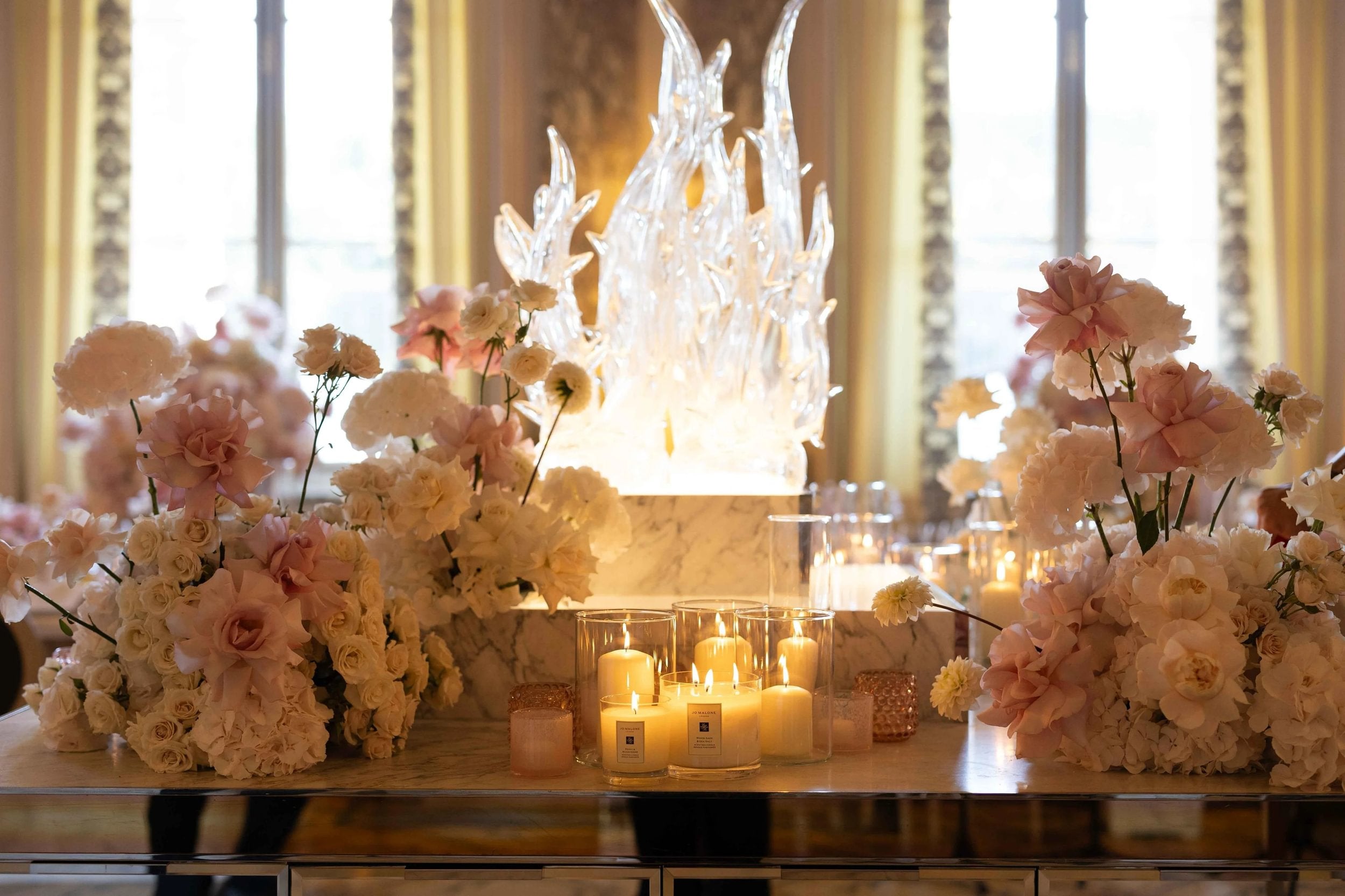 The result: sculptural floral arrangements that danced through the length of the tables, their soft tones of blush, ivory, and petal pink harmonising perfectly with the ornate gold and marble interiors of the room.