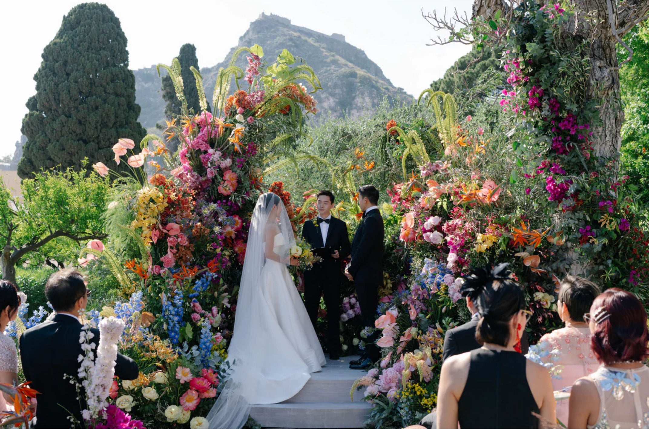 The hills of Sicily played host to a remarkable celebration of love this June. Joyce and Chris' special day was elevated by our floral arrangements, which graced the welcome, party for their guests, as well as the wedding ceremony and reception set against Taormina's breathtaking views.