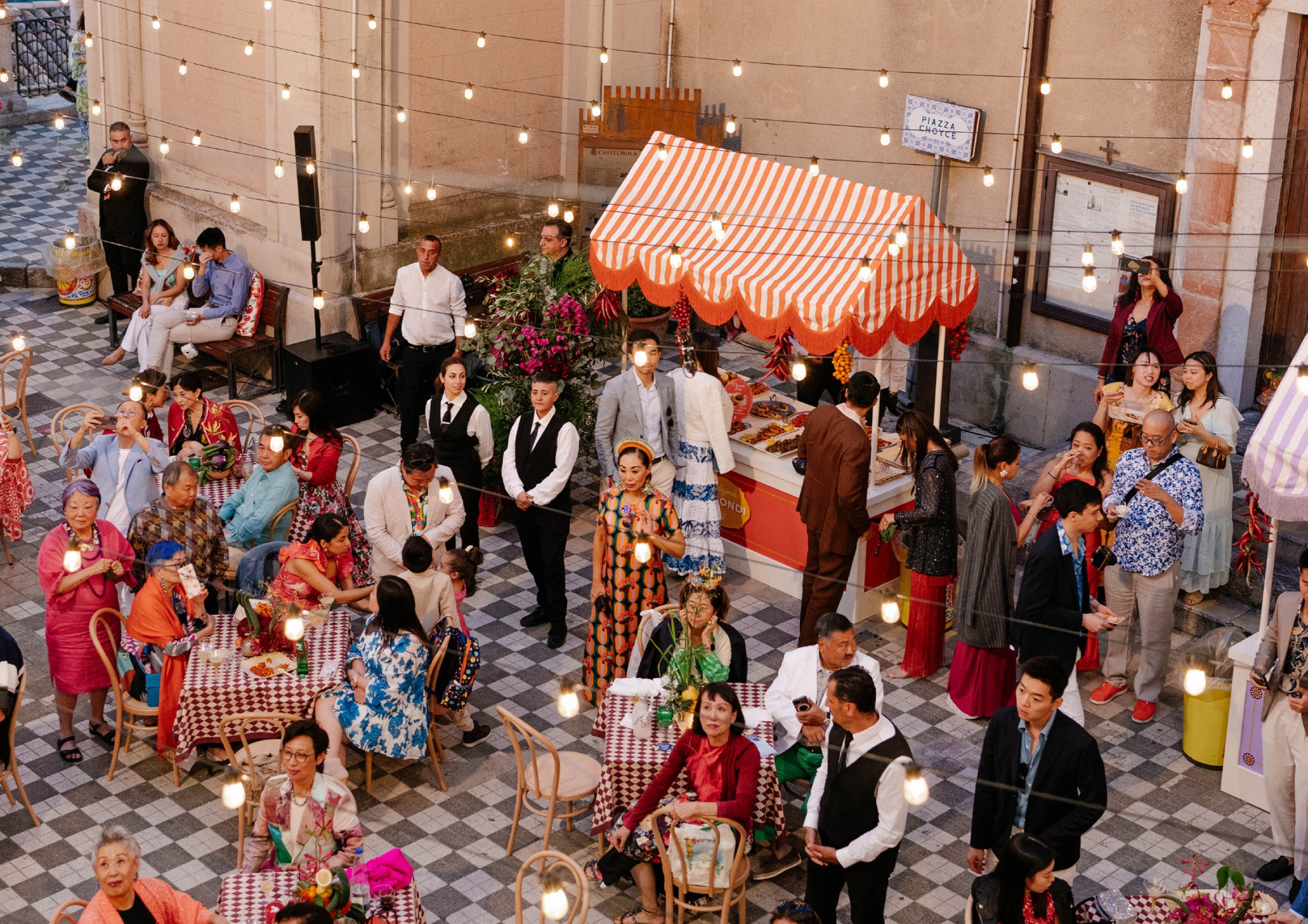 The celebrations began with a takeover of Castelmola's piazza for a lively street party. Each table was adorned with a vibrant mix of fruit and flowers, creating a truly special Sicilian atmosphere. To tie everything together, we decorated the gelato stand with floral installations that mirrored the tables, ensuring a cohesive and enchanting ambiance throughout the event.