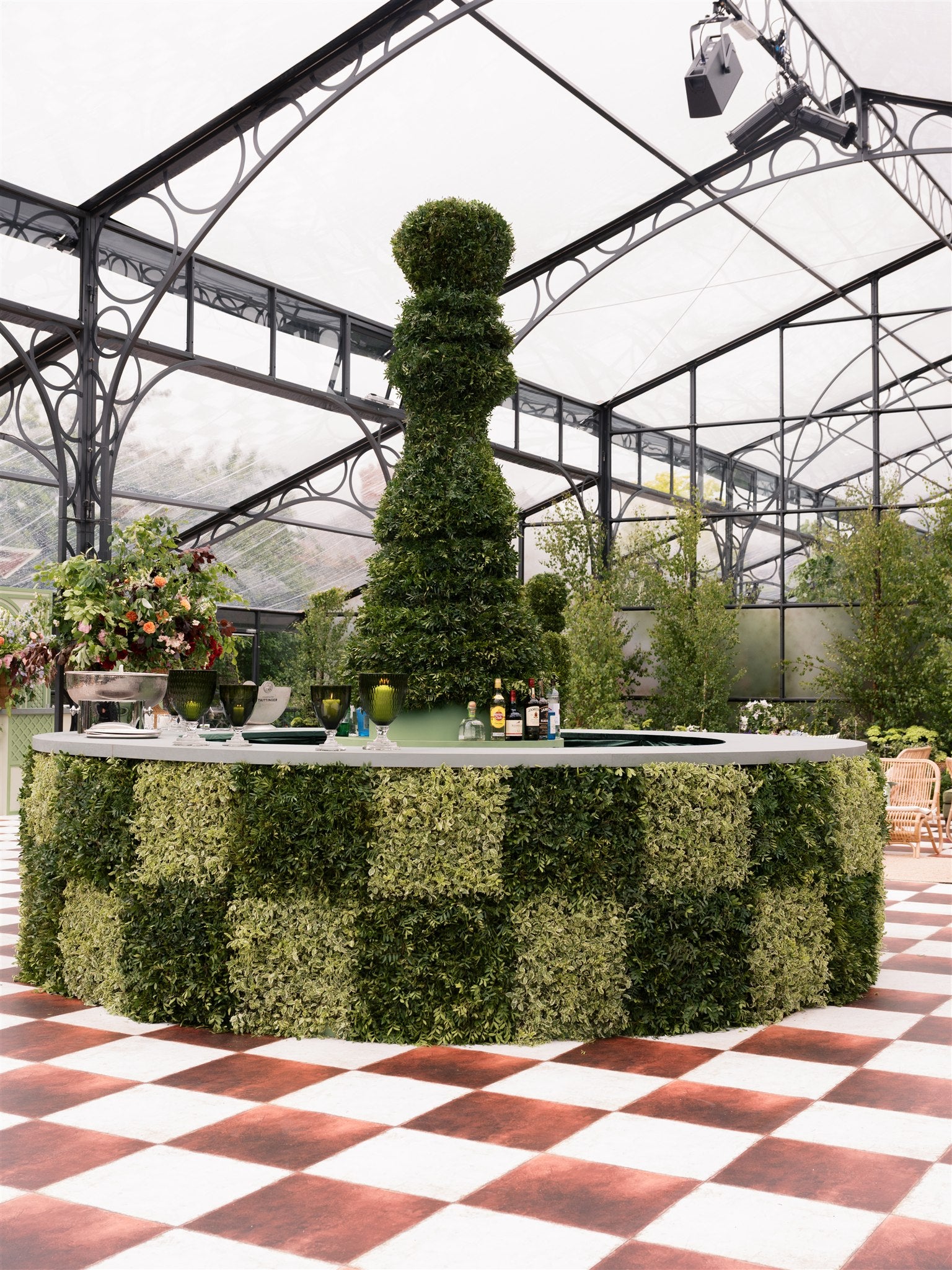 The drinks reception was inspired by the groom’s love of chess, with striking topiary chess pieces thoughtfully placed throughout the space and even integrated into the bar design. The sculptural bar, dressed in a checkerboard of verdant foliage, stood as a bold focal point beneath the pavilion’s sweeping glass arches.