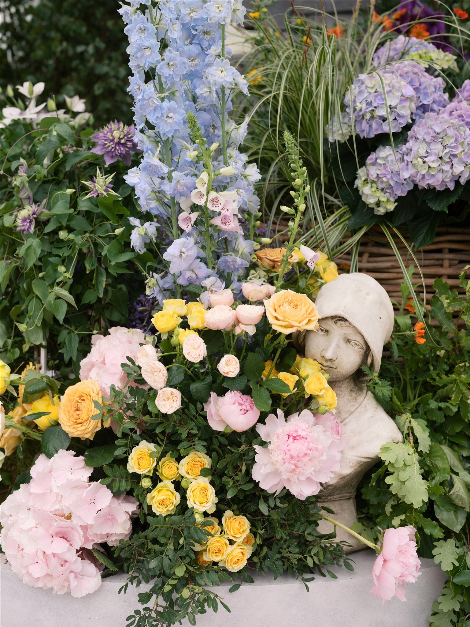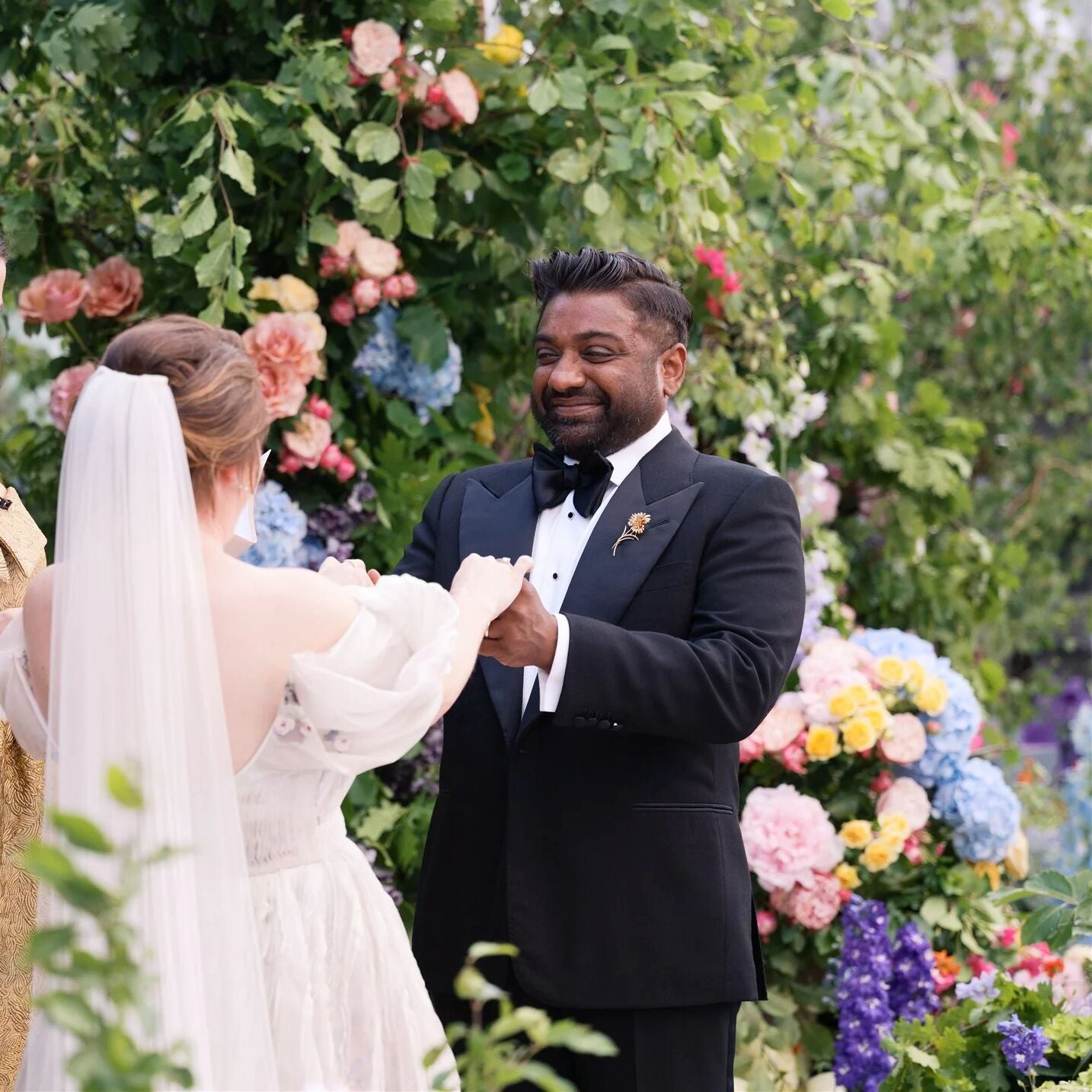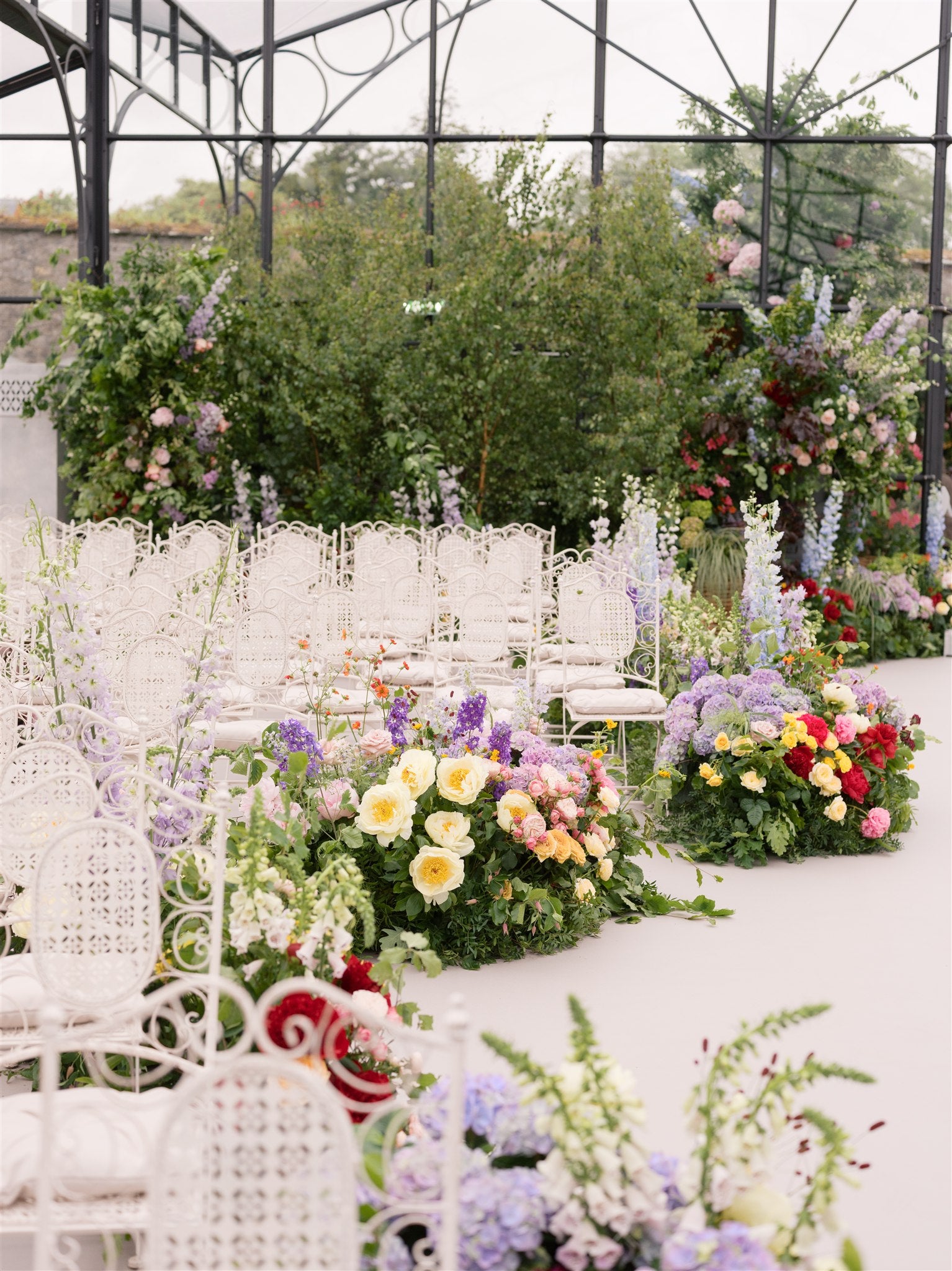 The ceremony was a breathtaking garden-like scene, brought to life with an abundance of delphiniums, peonies, hydrangeas, roses and more - an immersive floral landscape that blurred the lines between nature and art. A long, winding aisle guided guests through meadows of soft colour and texture, leading toward a spectacular altar framed by tall trees and lush floral artistry.
