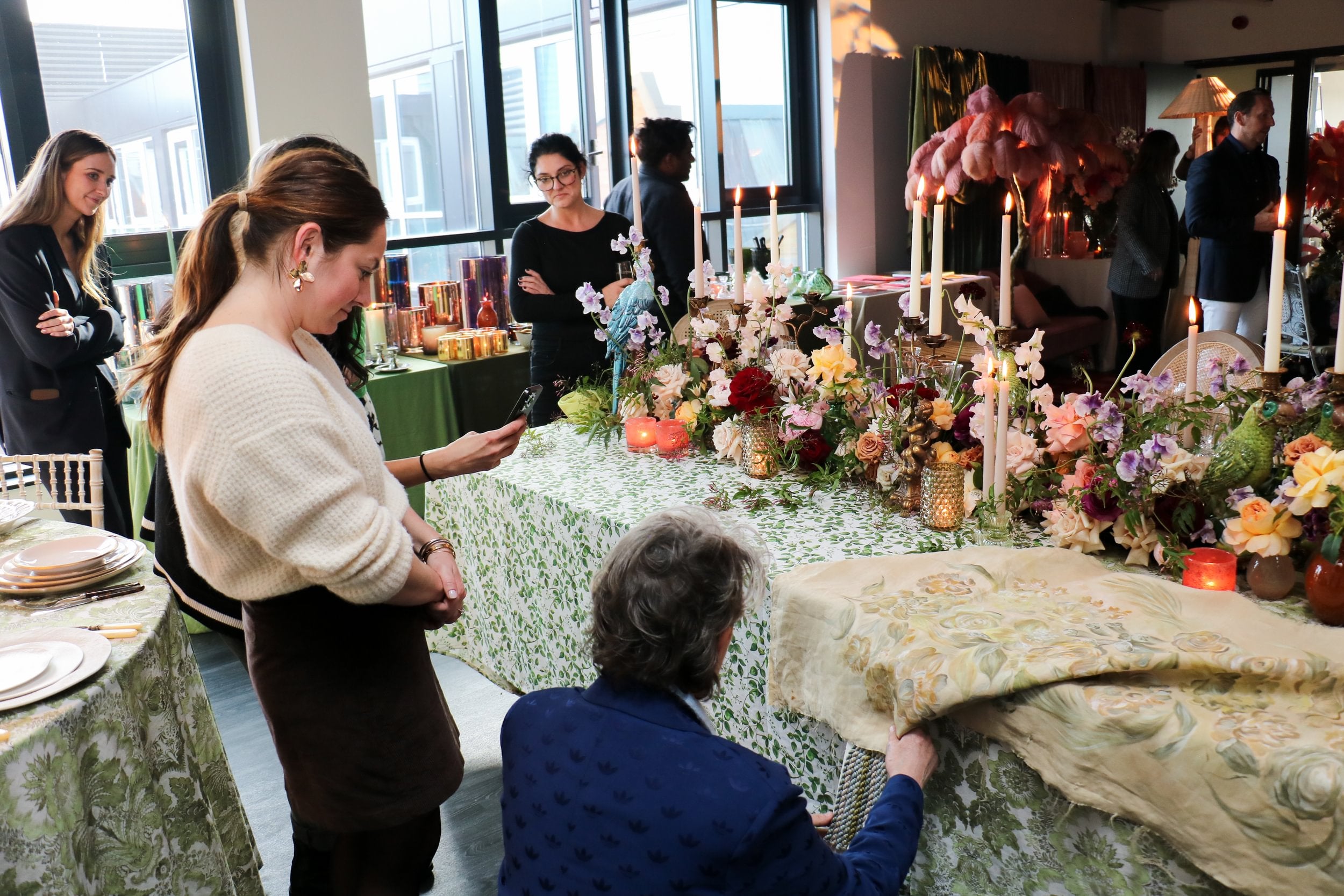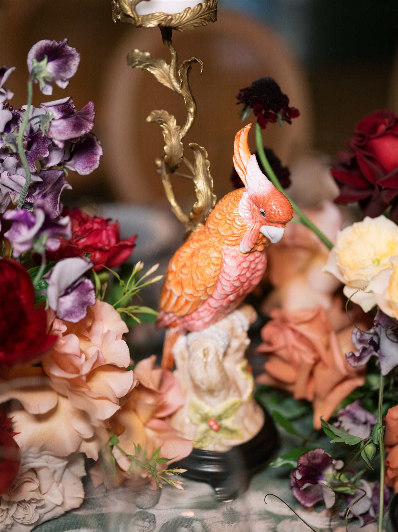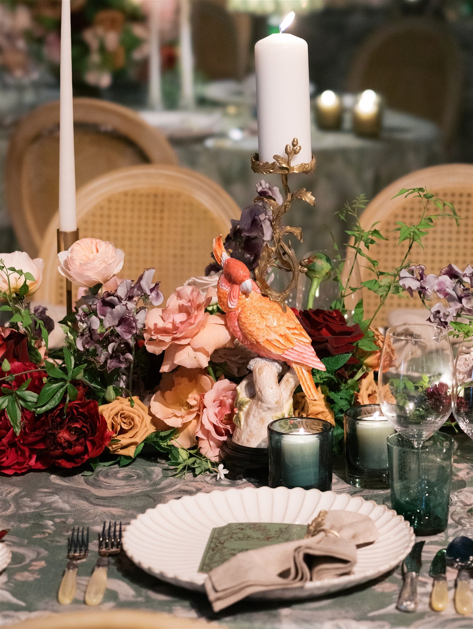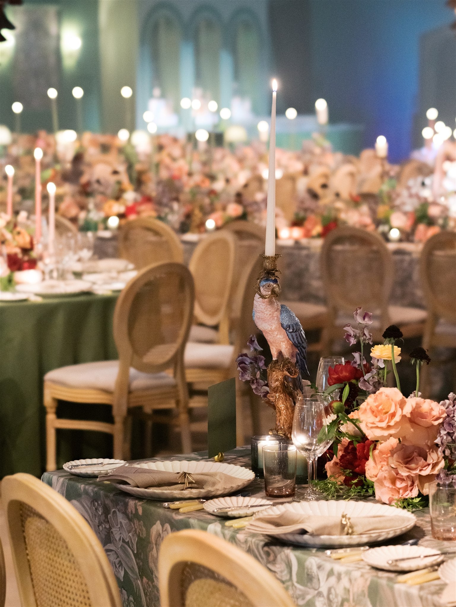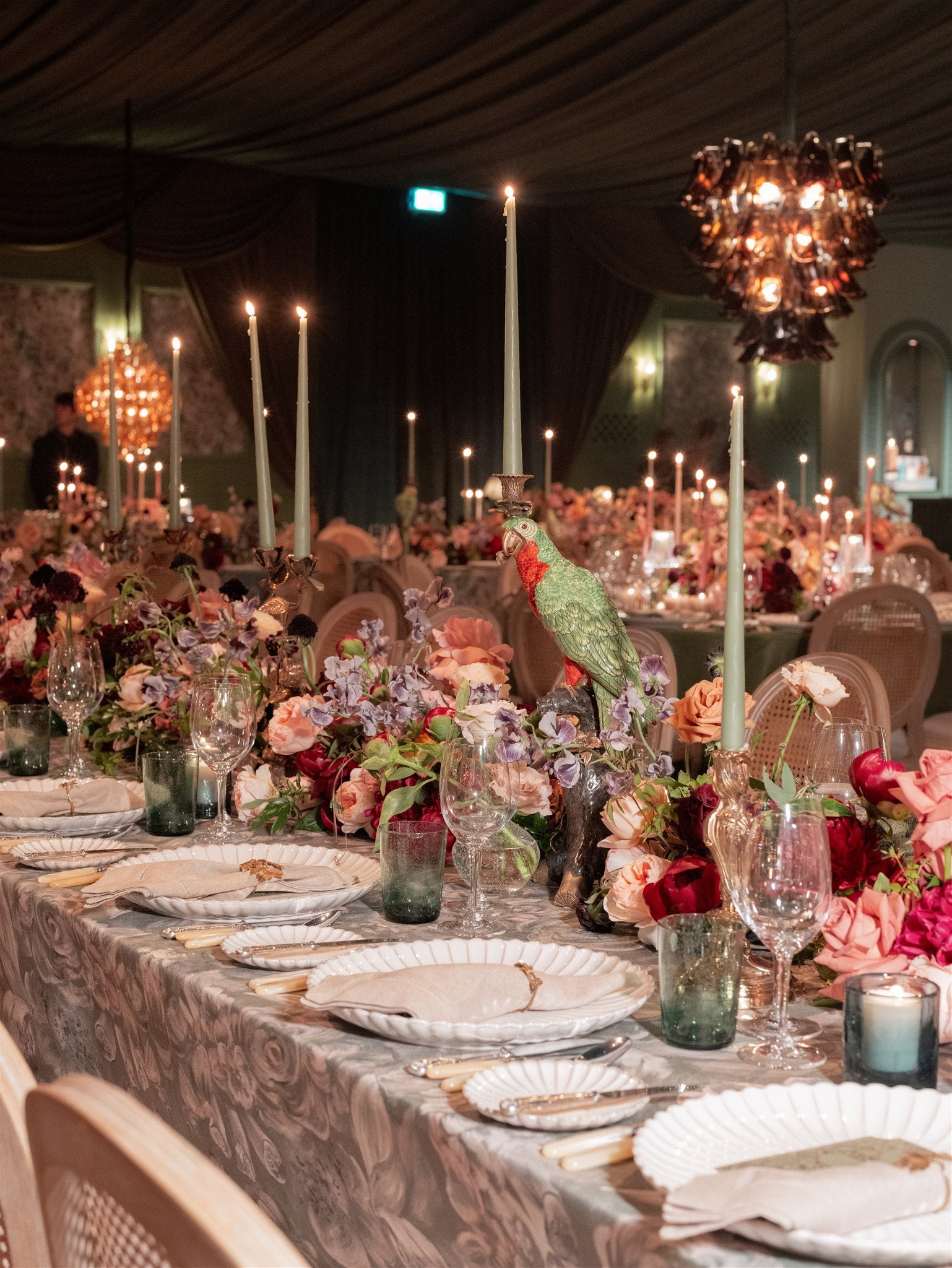 Bespoke tabletops and varying table sizes created visual rhythm throughout the room, while candlelight, elegant candelabras and artfully dressed napkins introduced layers of texture and sophistication. Long banquet tables were adorned with sculptural flower arrangements and whimsical ceramic parrots perched among vases, each adding a playful yet polished touch.
