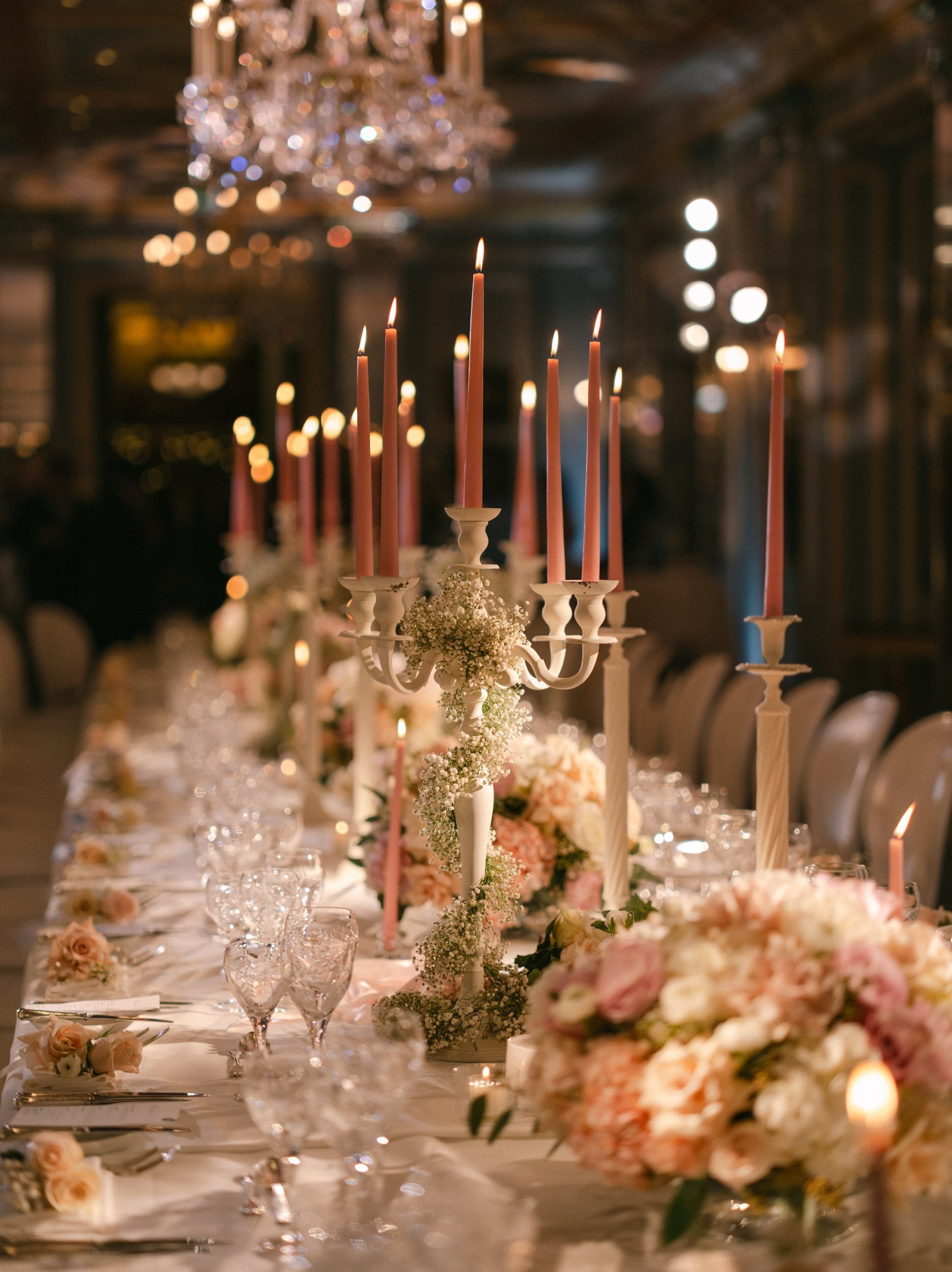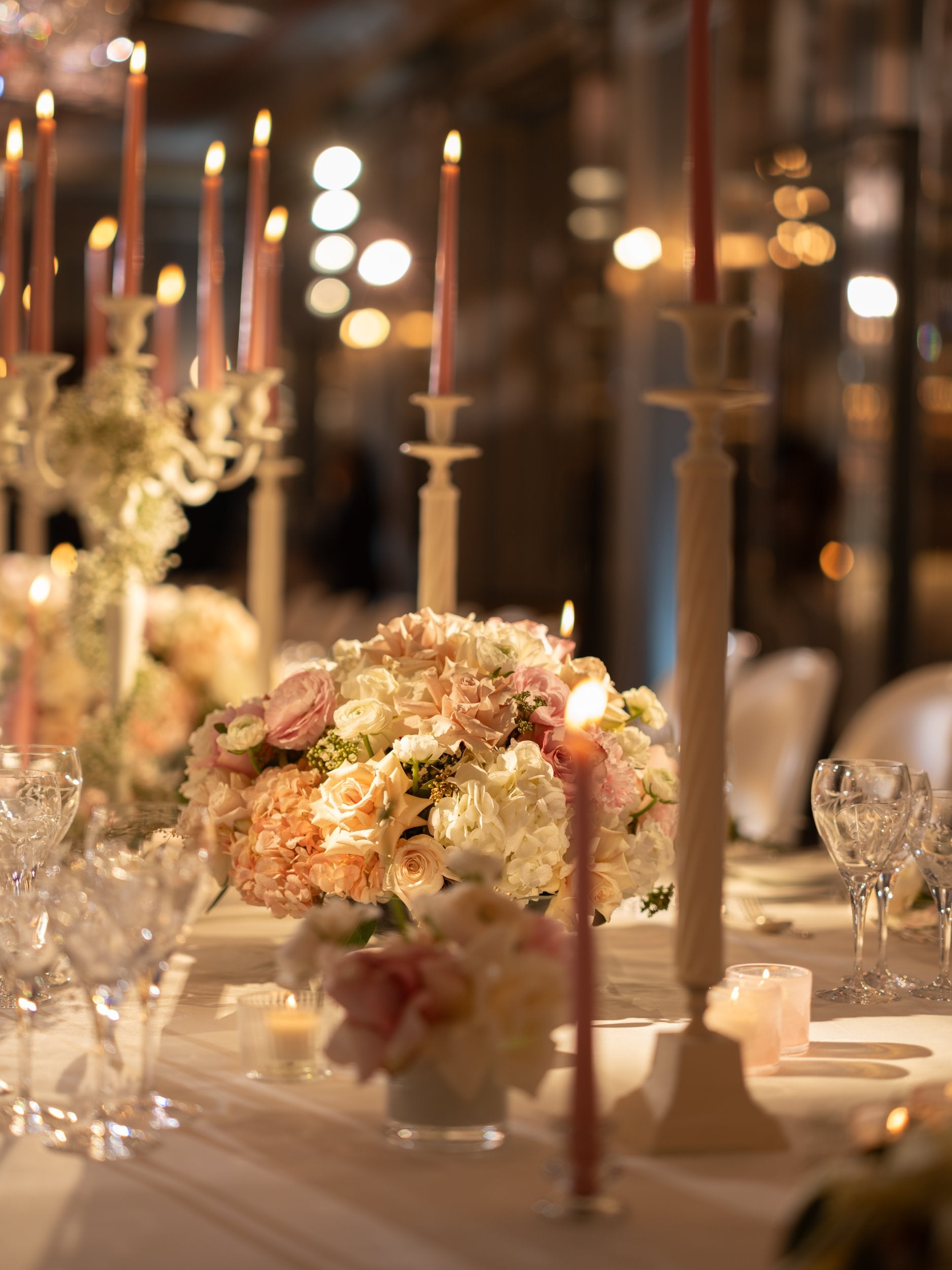 By harmonising soft pink hydrangeas, fragrant roses, and seasonal greenery, our design brought a sense of grace and beauty to the event. Soft pink hydrangeas added a touch of romance, fragrant roses infused the air with a delightful aroma, and the seasonal greenery provided a natural and lush backdrop. This elegant combination adorned the candelabra bases, creating a visual symphony of colours and textures. Delicate gypsophila, with its ethereal quality, gracefully spiralled around the candelabra bases, adding a touch of delicacy and charm to the overall design.