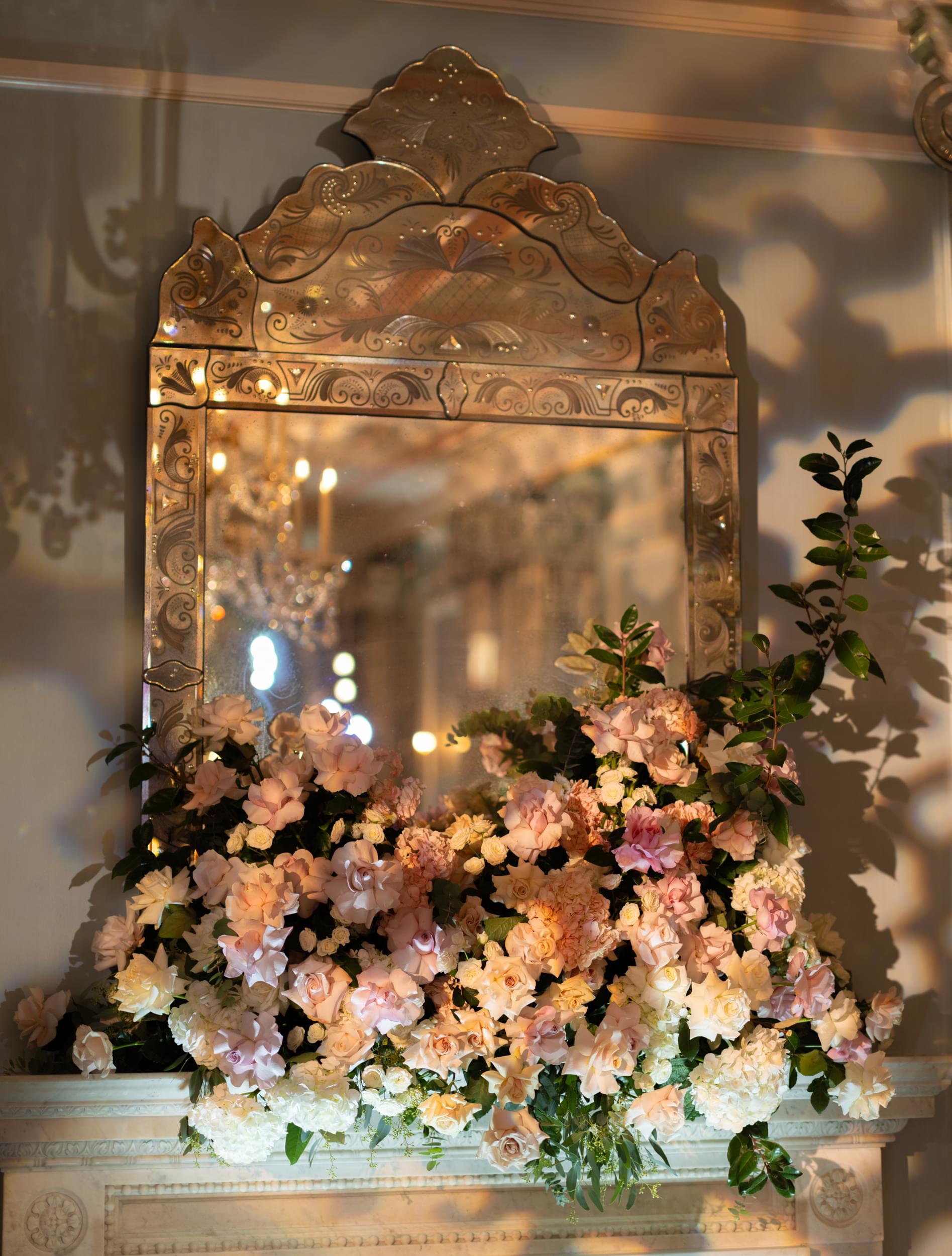 The fireplace, standing as a focal point within the space, received special attention from our team. It was graced with an exquisite arrangement that not only enhanced the visual appeal but also served as a