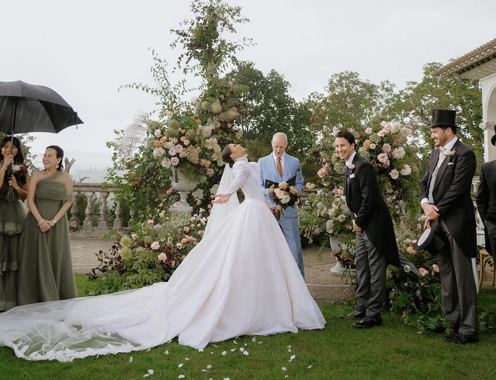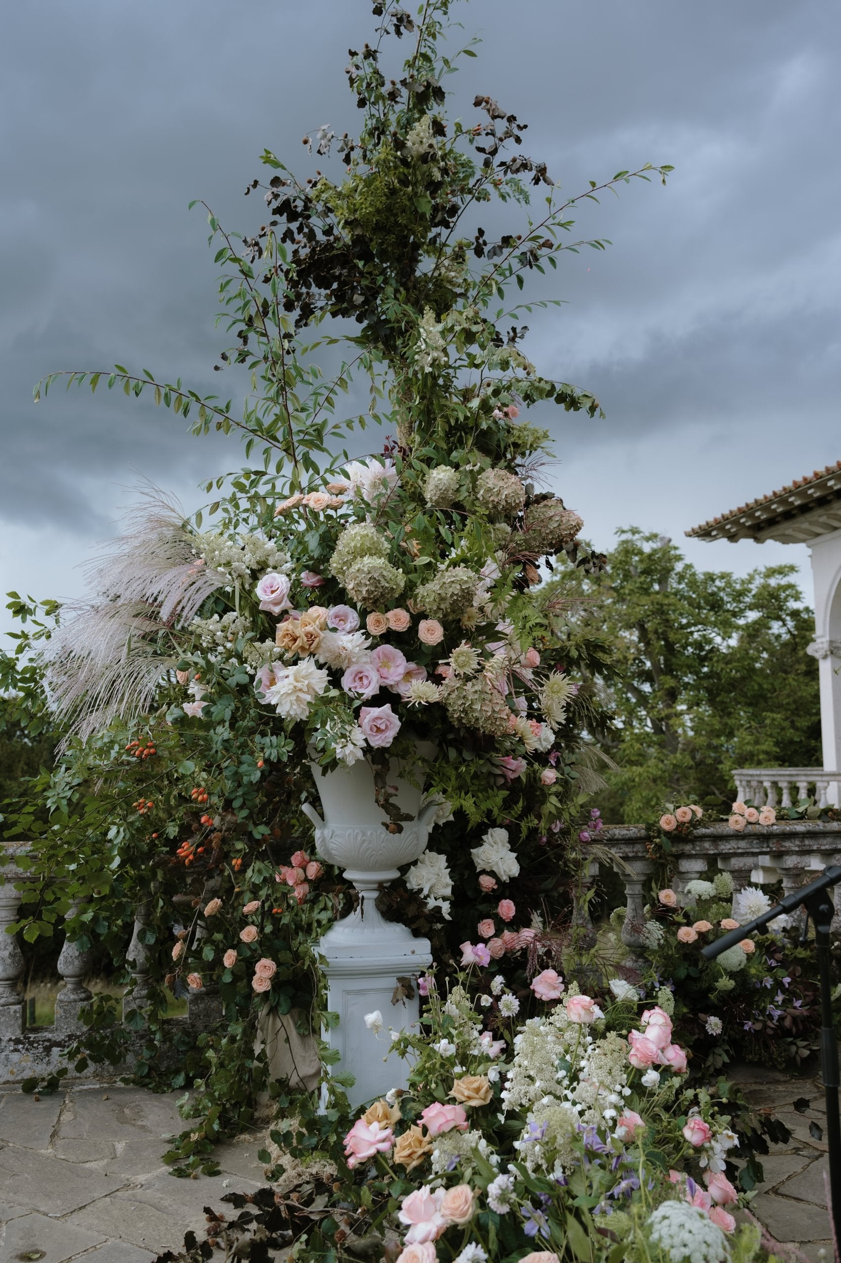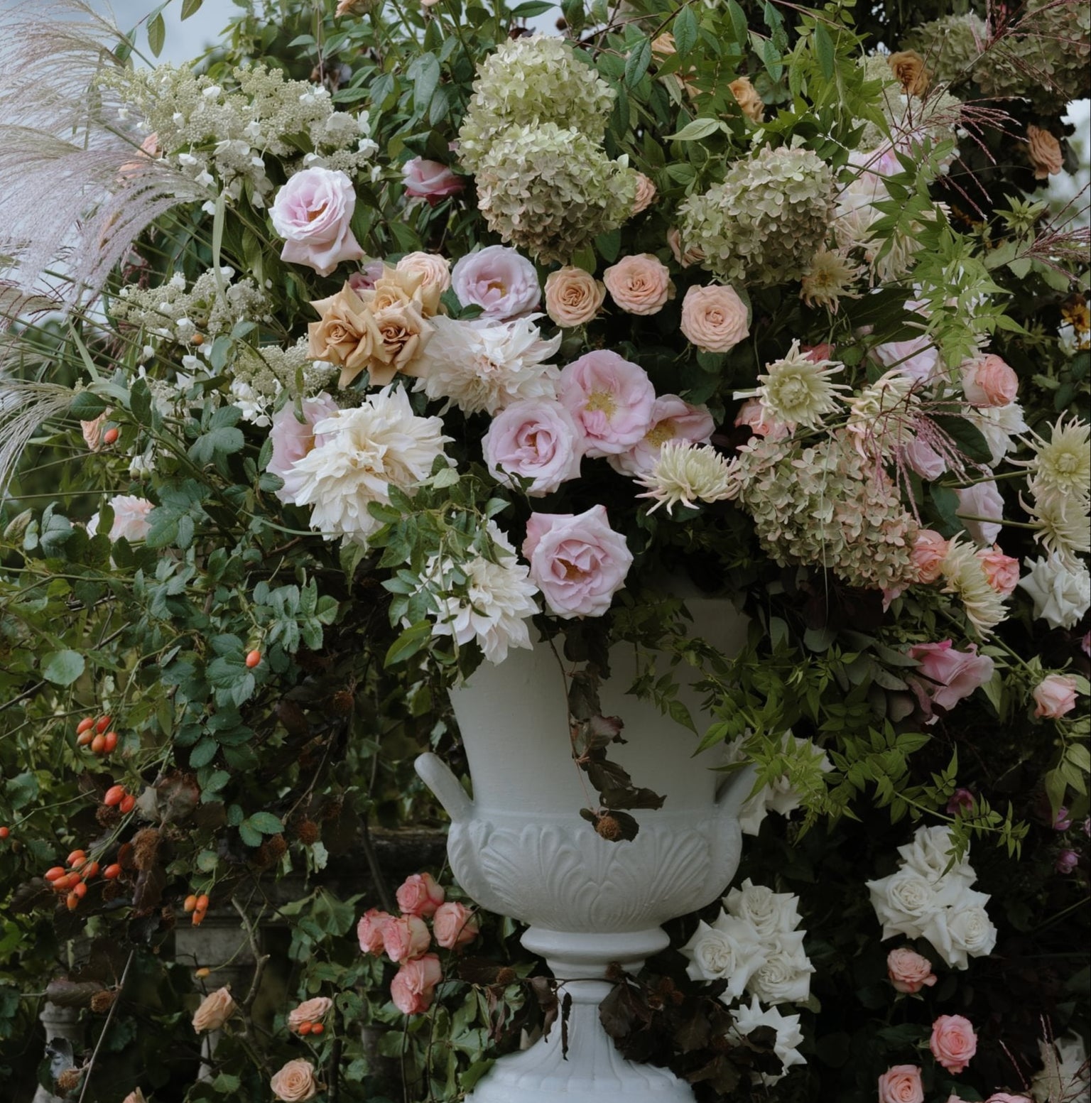 The skies opened on the ceremony just as Lovi met Monty at the end of the aisle. The scene filled with stunning urns framing the aisle, bursting with dahlias, hydrangea and roses, and Lovi, with her bridal bouquet in hand, filled with white cloud, playa blanca, aprikola and cappuccino roses, blush butterfly ranunculus, cotinus and white Japanese anemones.