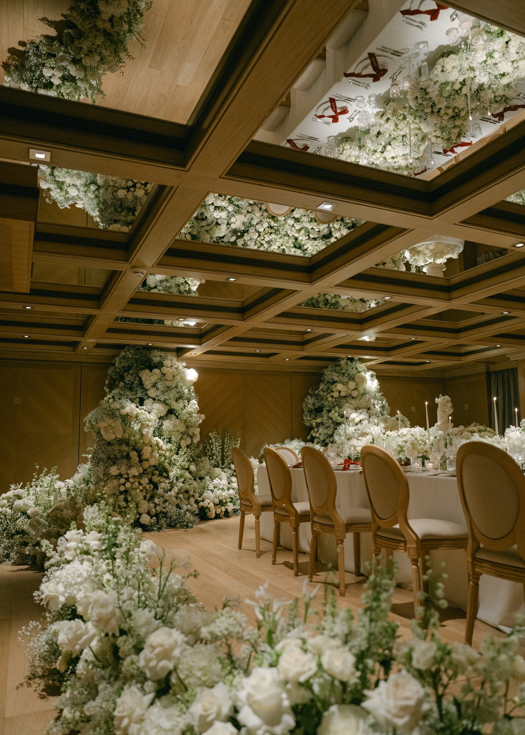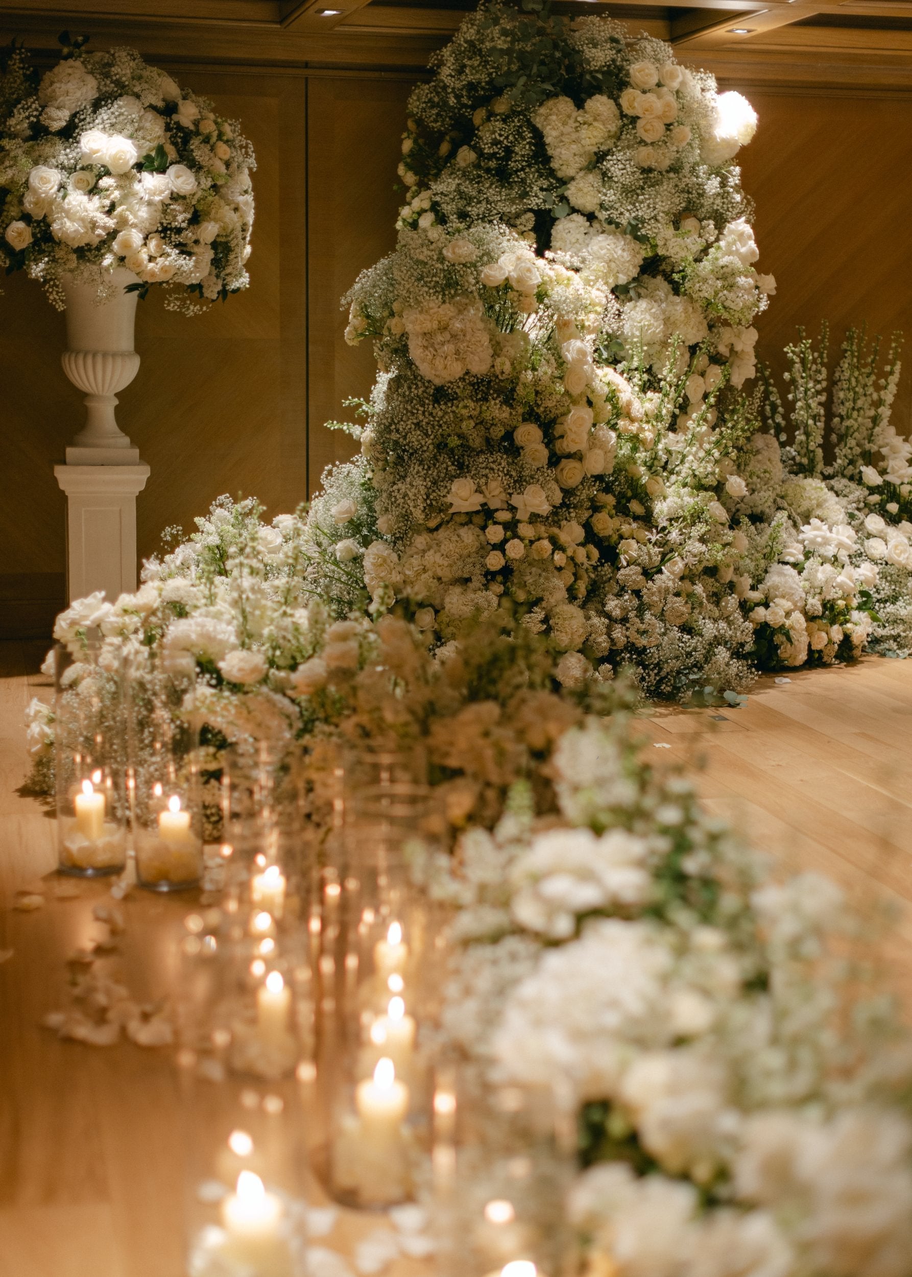 For the aisle, the floral arrangements were nothing short of breathtaking. A pathway lined with lush white roses, hydrangeas, and peonies created an intimate and dreamlike setting. Tall ceramic urns overflowing with delicate blooms were strategically placed along the aisle, enhancing the enchanting ambiance. As the bride made her way to the altar, she was surrounded by a whimsical floral cloud, with petals gently strewn along the floor, evoking the magic of a fairy tale. The overall effect was one of grace, romance, and timeless beauty, ensuring that every step toward the altar felt like walking through a floral dream.