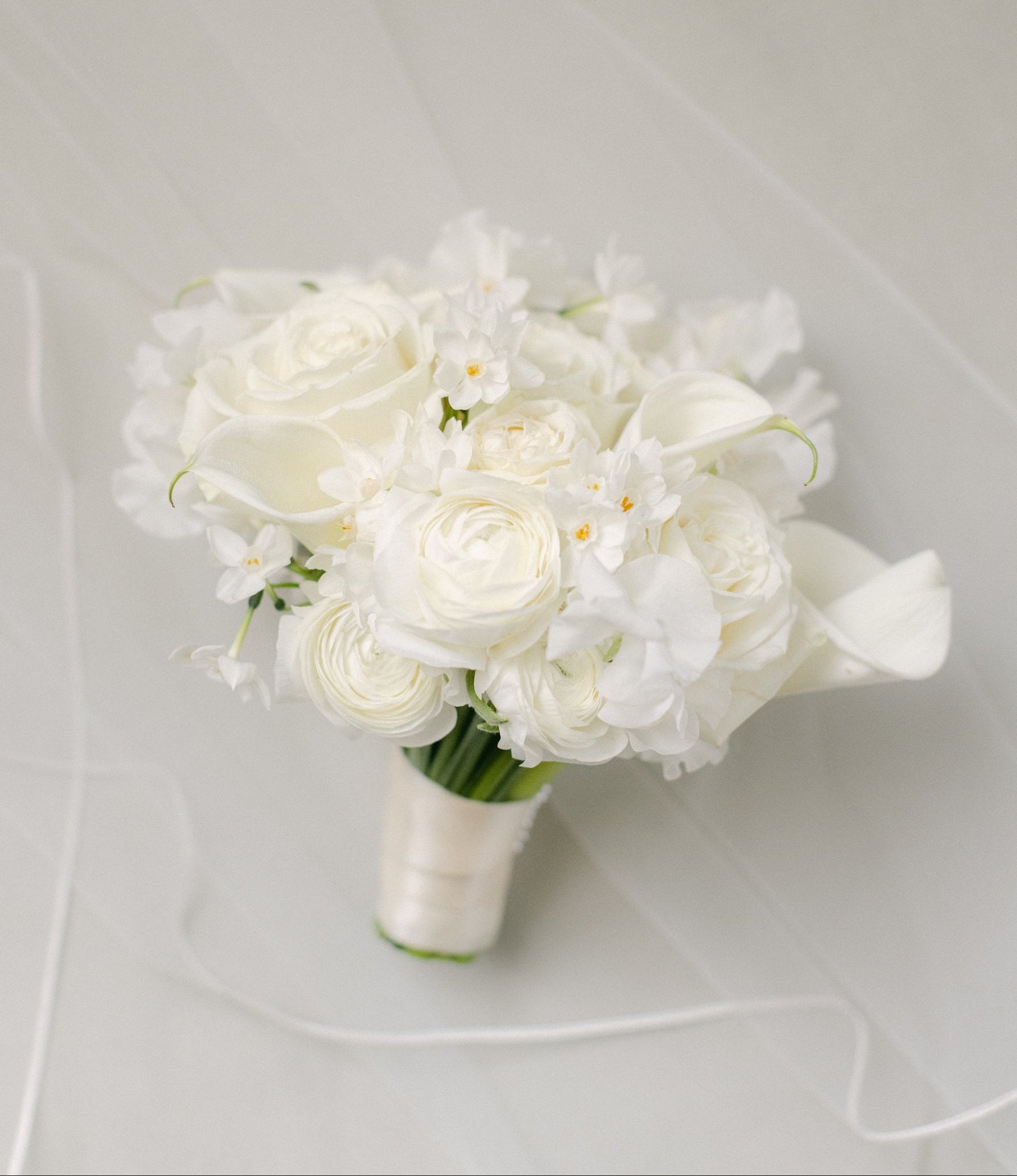 The bridal bouquet was a dreamy arrangement of white garden roses, peonies, and lisianthus, with trailing jasmine and sweet pea adding soft movement. Hints of eucalyptus brought a fresh contrast, while a silk champagne ribbon tied it all together in an effortlessly elegant finish.