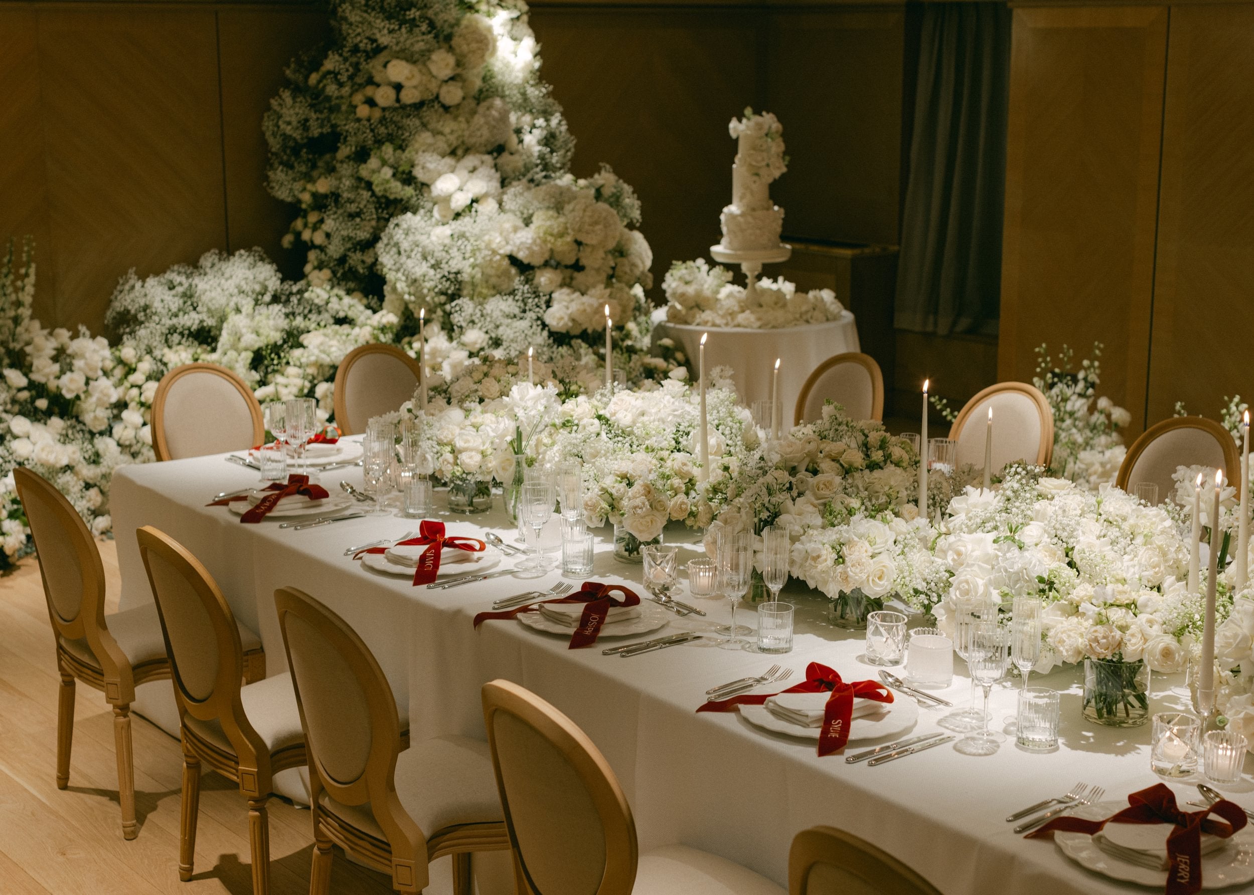 The table setting at this dreamlike wedding was a masterpiece of elegance and sophistication. Each table was adorned with crisp white linens, creating a pristine canvas for the floral artistry. Delicate handwritten place cards and crystal glassware reflected the soft candlelight, adding a warm, romantic glow. The tableware was carefully curated with gold-rimmed plates and cutlery, adding a touch of opulence. Towering floral centerpieces in soft ivory, blush, and pastel hues cascaded gracefully, interwoven with delicate greenery and trailing vines, creating an ethereal garden-like atmosphere.