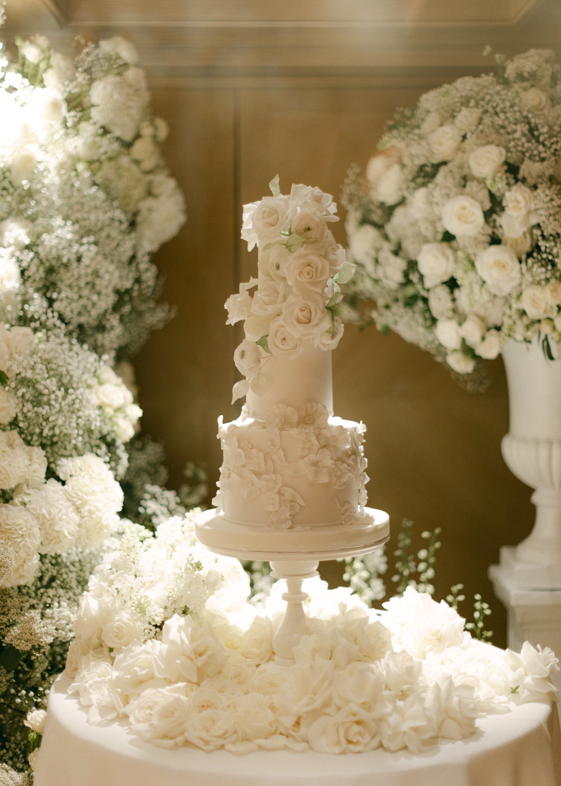 The wedding cake was a multi-tiered masterpiece, adorned with delicate sugar flowers mirroring the fresh blooms of the day. Ivory fondant with lace-like detailing and gold leaf accents gave it a refined, romantic touch. Fresh white roses and cascading orchids framed each tier, while layers of vanilla bean sponge, raspberry compote, and white chocolate ganache made it as delicious as it was beautiful.