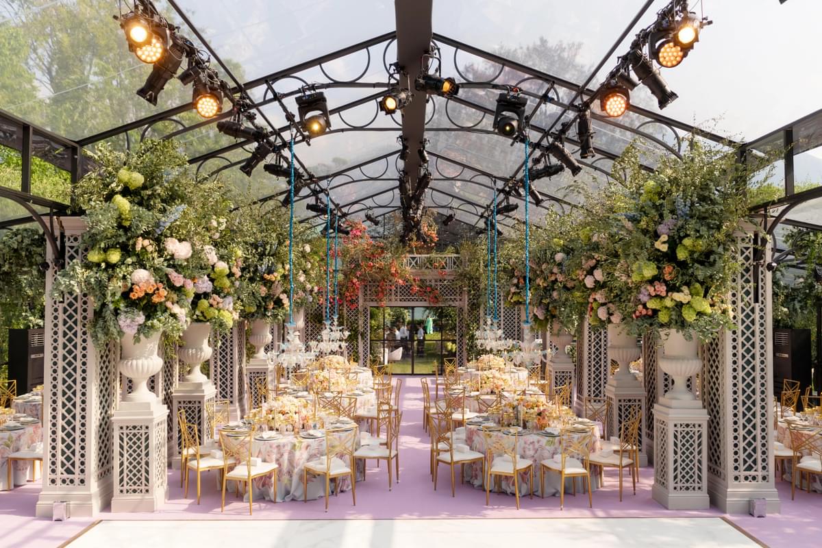 For this special occasion, our Events Team transformed the glass orangery into a beautiful garden-inspired oasis. The walls were adorned with intricate 3D lattice panels and elegant urns, while stunning crystal chandeliers hung from the ceiling, creating an atmosphere of sophistication and enchantment.