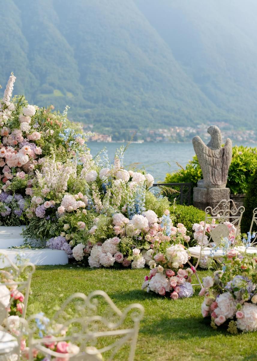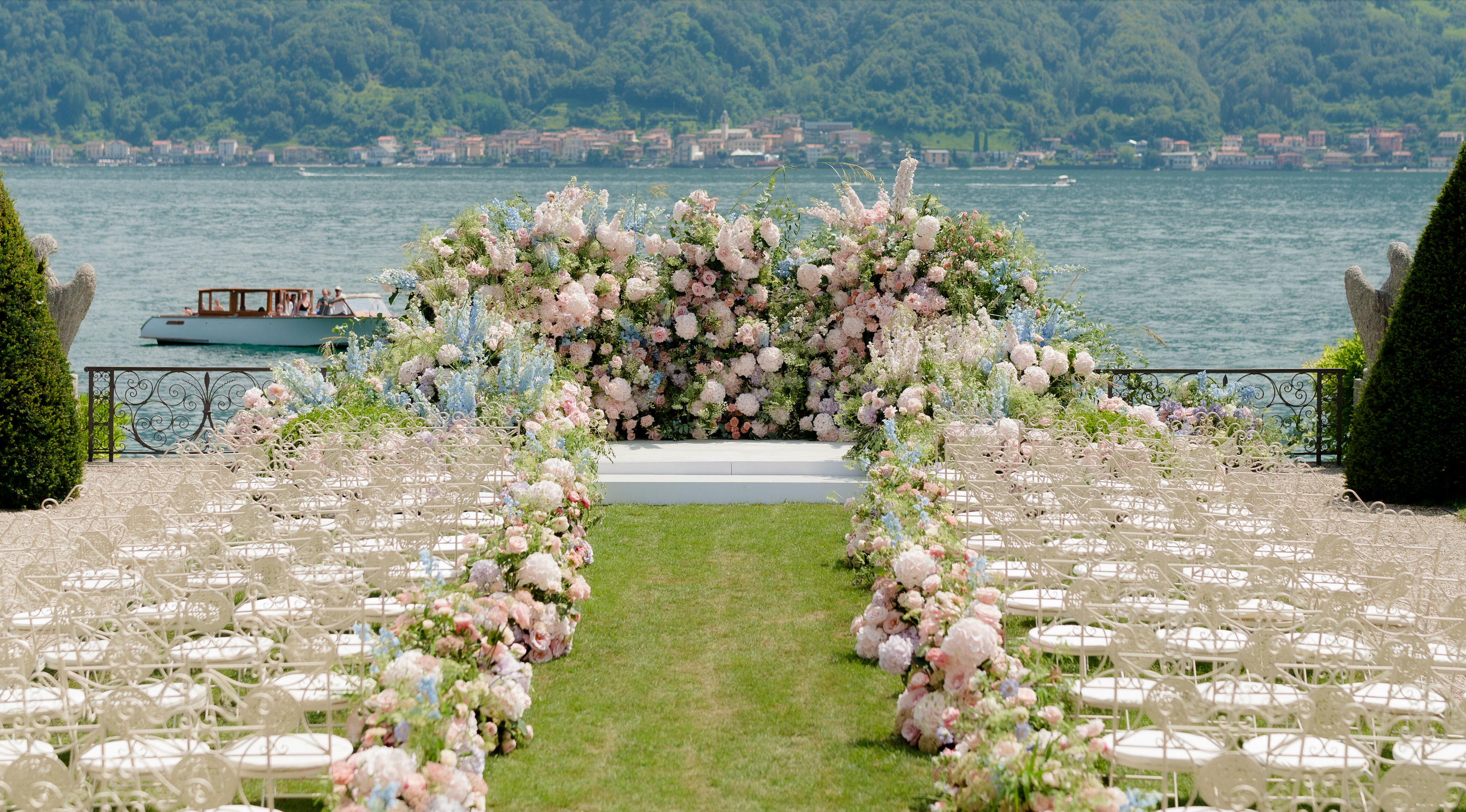 Fuelled by passion and dedication, our talented events team crafted a spectacle of floral grandeur amidst the sizzling Italian heatwave. With the finest seasonal flowers in dreamy pastel colours – their artistry elevated the day to become something quite extraordinary. At the top of the aisle, a cloud like meadow of roses in cream and blush tones created a stunning backdrop for the ceremony. The soft colours of the flowers perfectly complemented the breathtaking views of Lake Como.