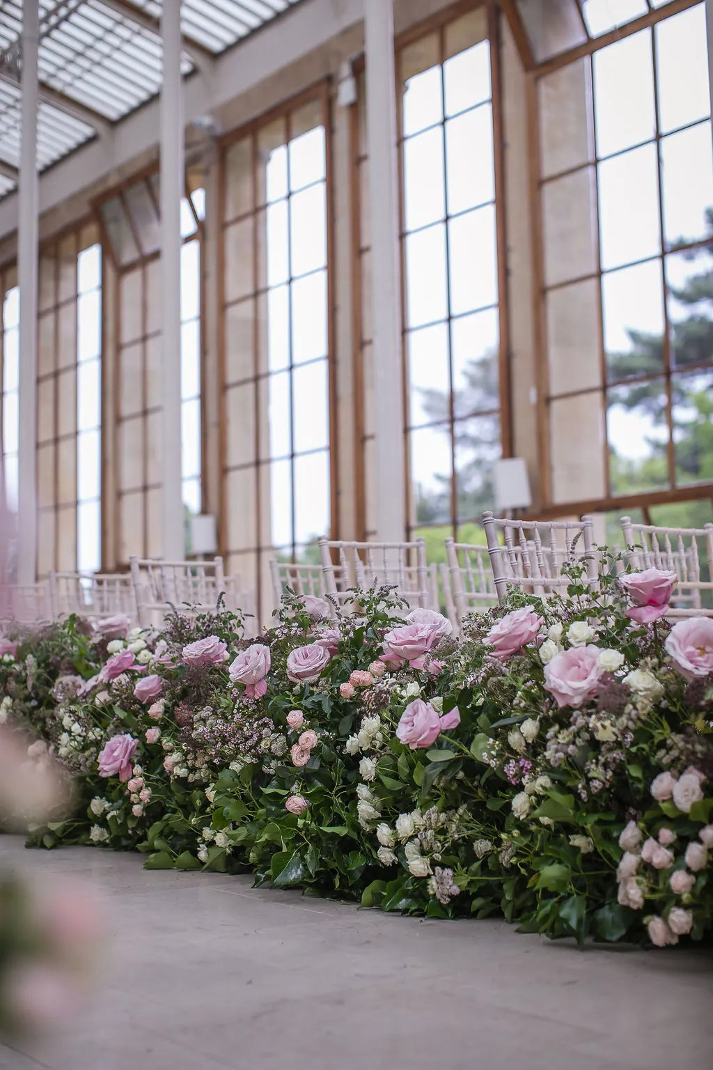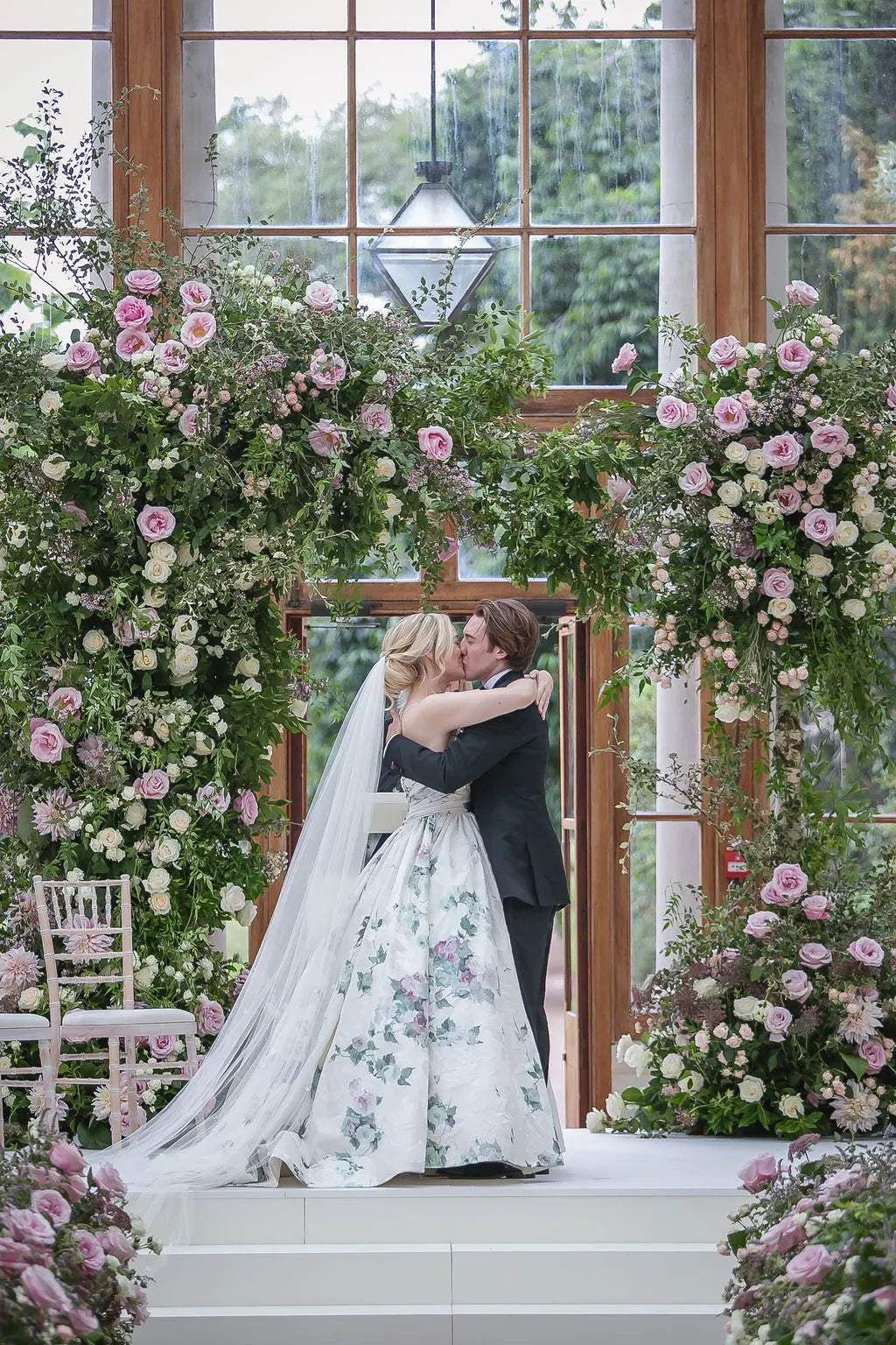 The Ceremony took place in the conservatory, where we created a walkway of square arches to the beginning and end of the aisle. These arches were made of beautiful mixed English foliage, with clusters of cream and pale pink peonies tumbling down the sides and pockets of bombastic and majolica spray roses cascading down to the bottom.
