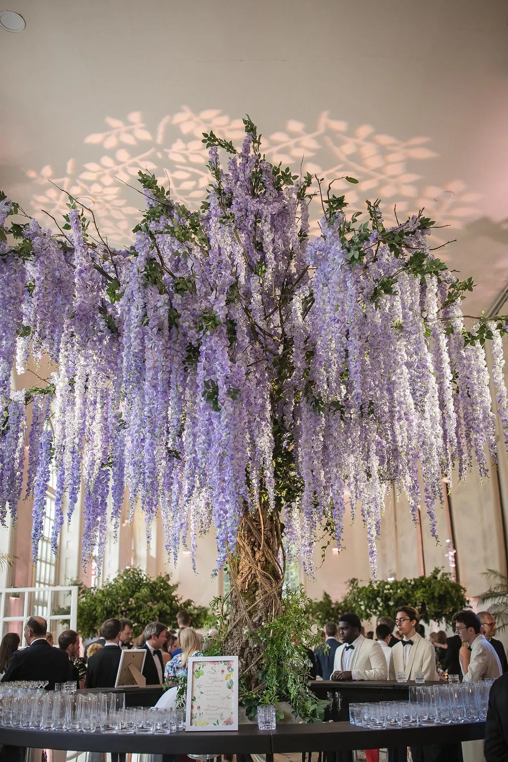 The middle of the room was filled with an eye-catching purple wisteria tree, creating a beautiful pop of colour. The bride and groom sat at the top table in amongst a magnificent custom made rose arbour canopy with climbing foliage growing up and over the frame and roses in all the pink shades tumbling out of the frame work.