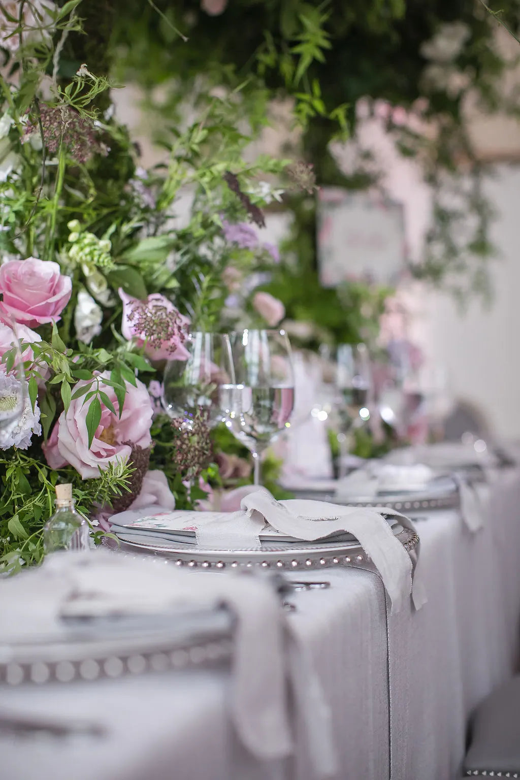 Running along the centre of the top table was a meadow of gorgeous secret garden roses, peonies, spray rose, astrantia and trailing jasmine...